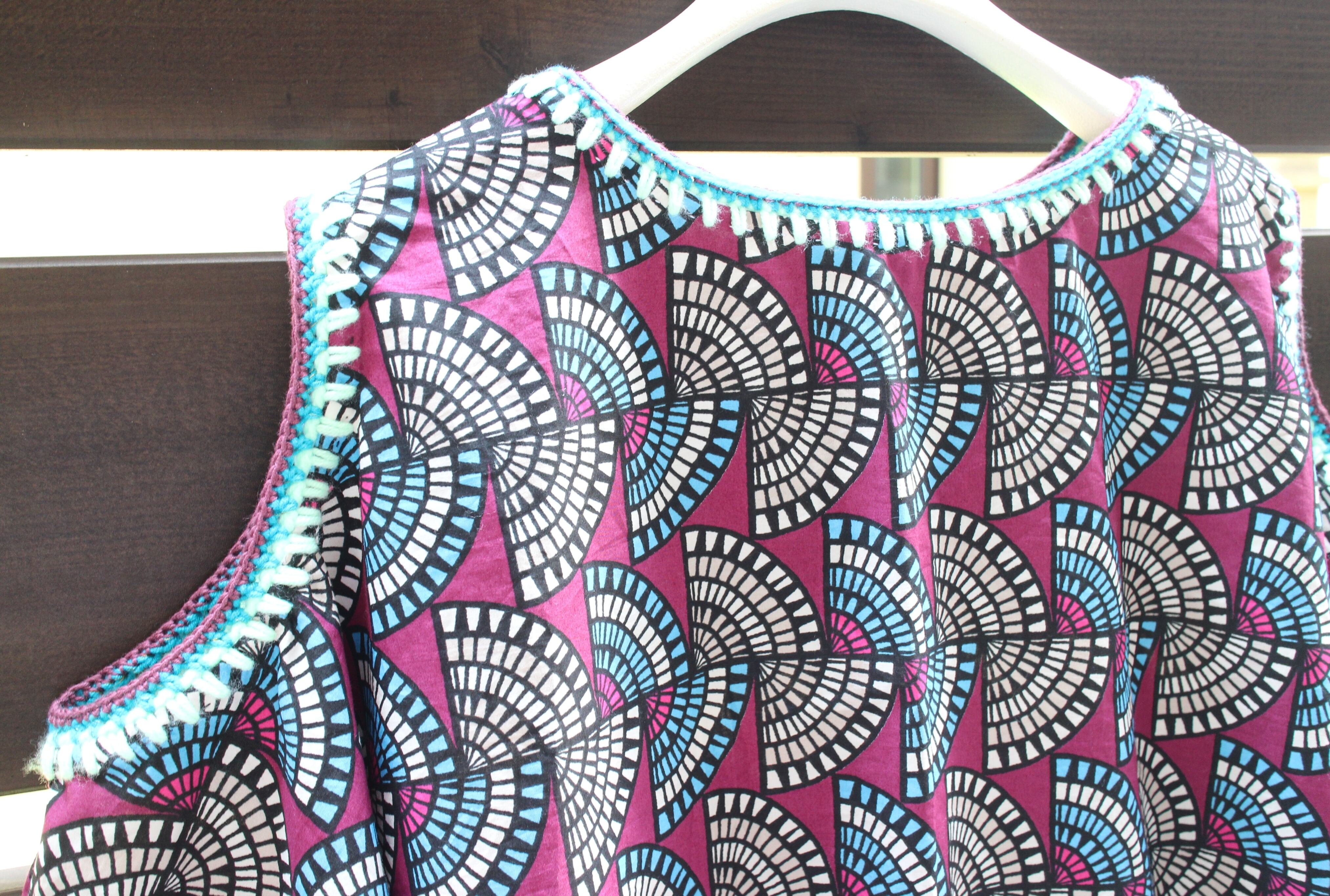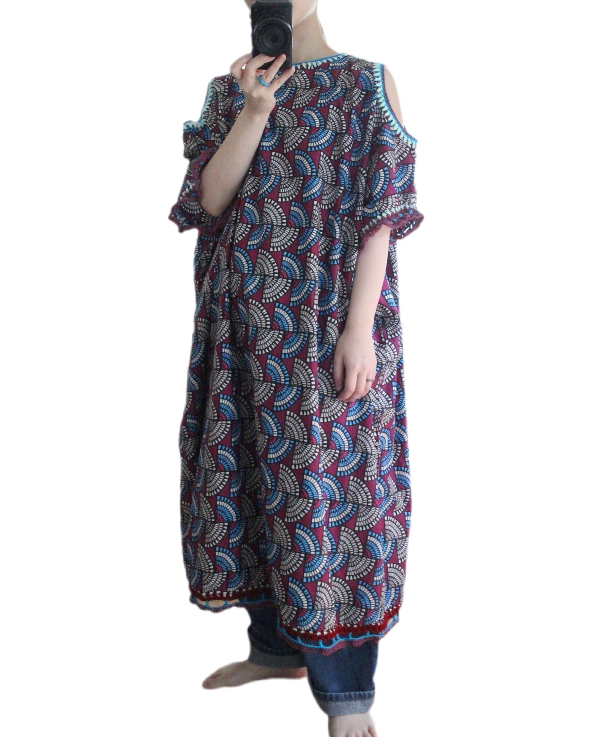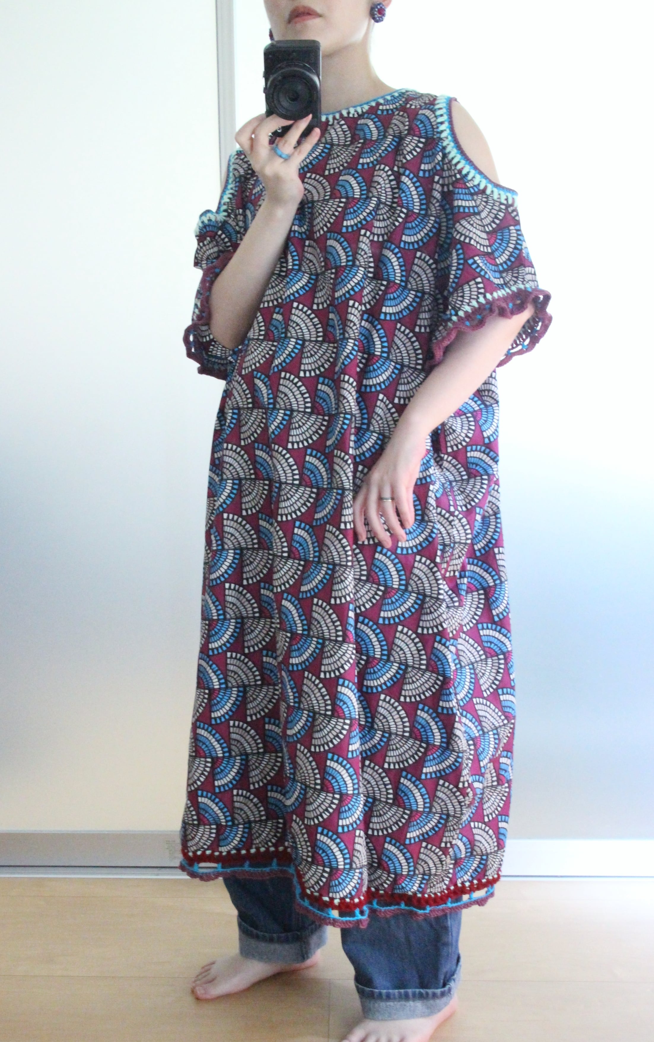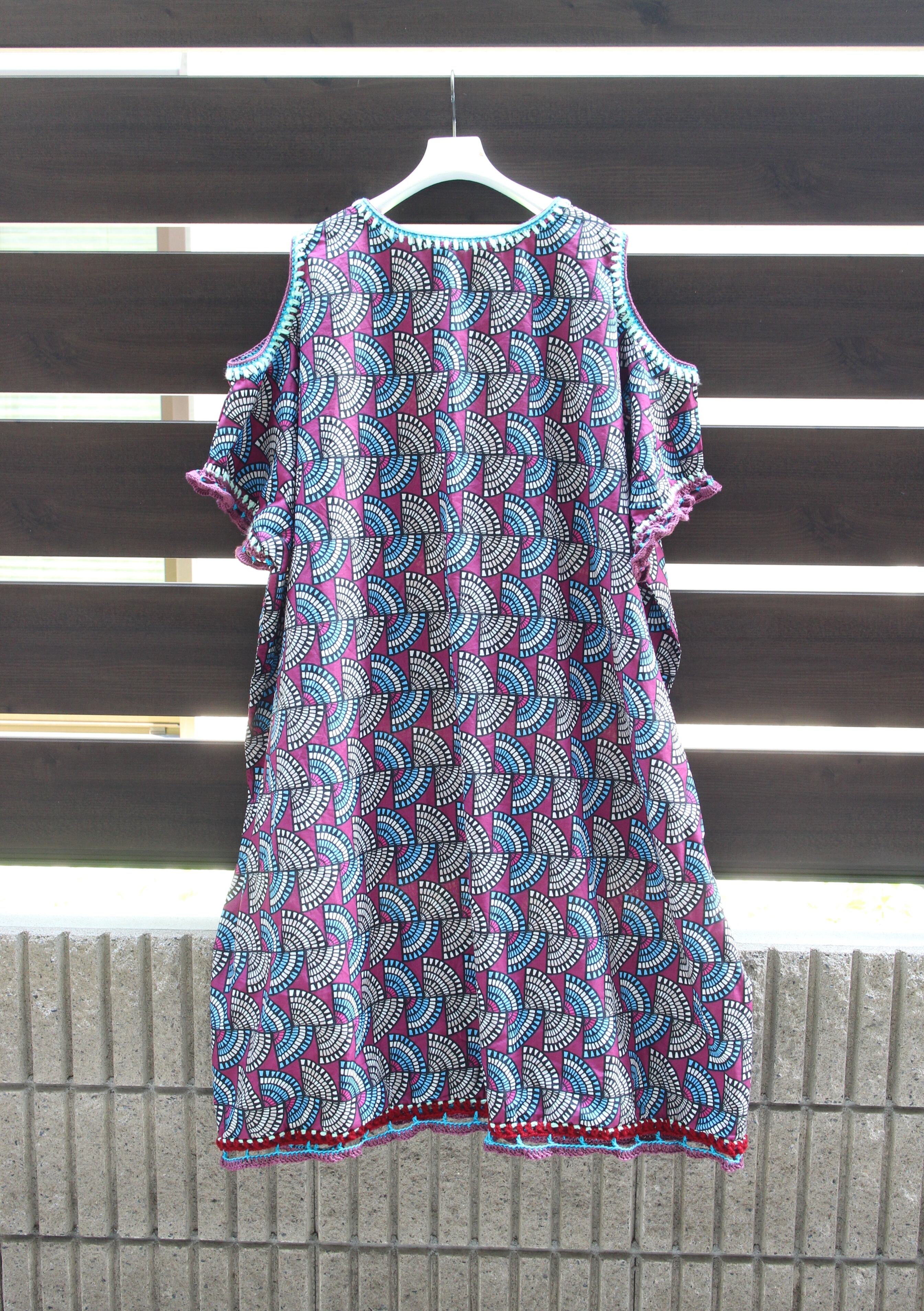 アフリカン的な幾何学模様の生地に装飾した肩開きワンピース◎