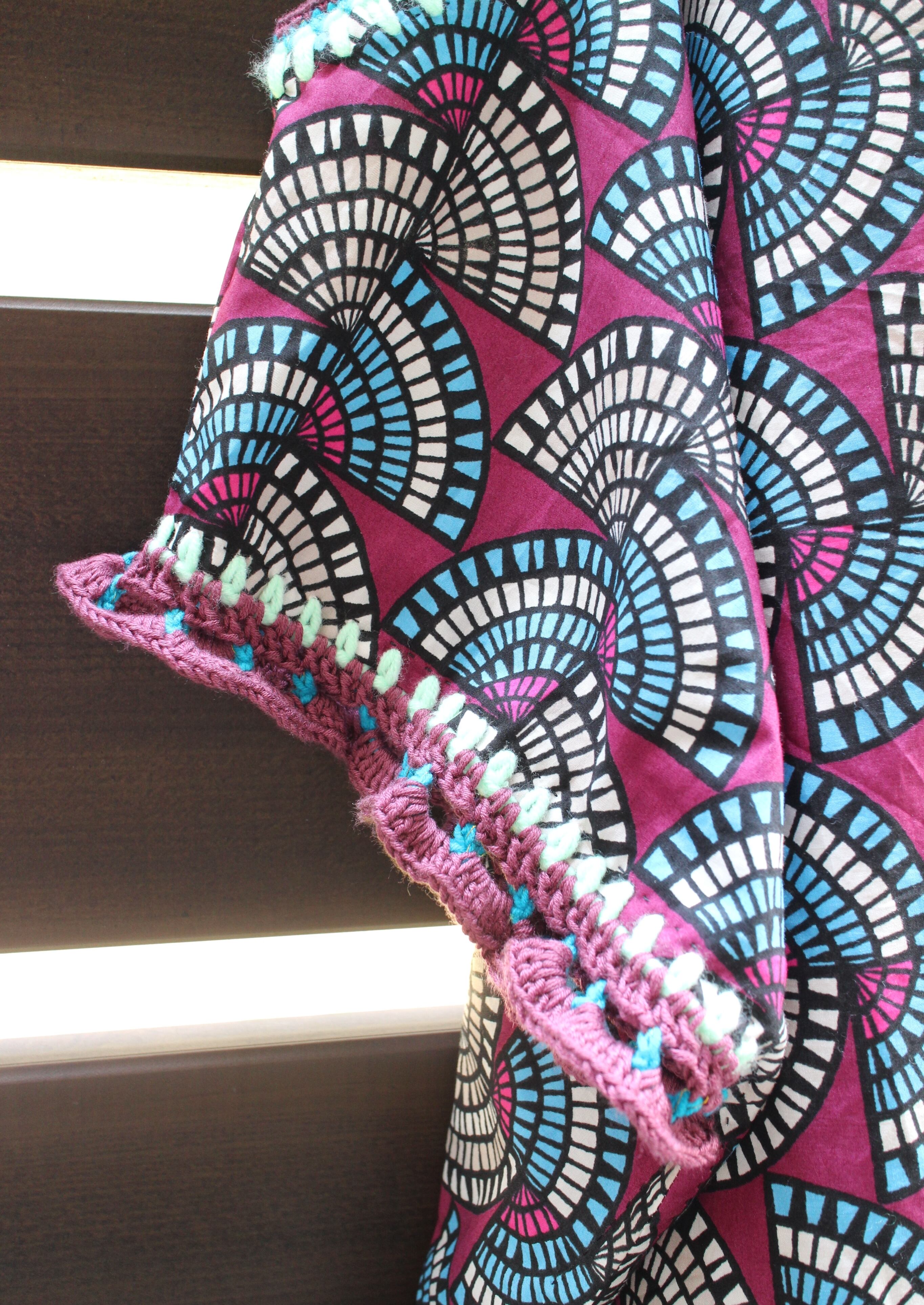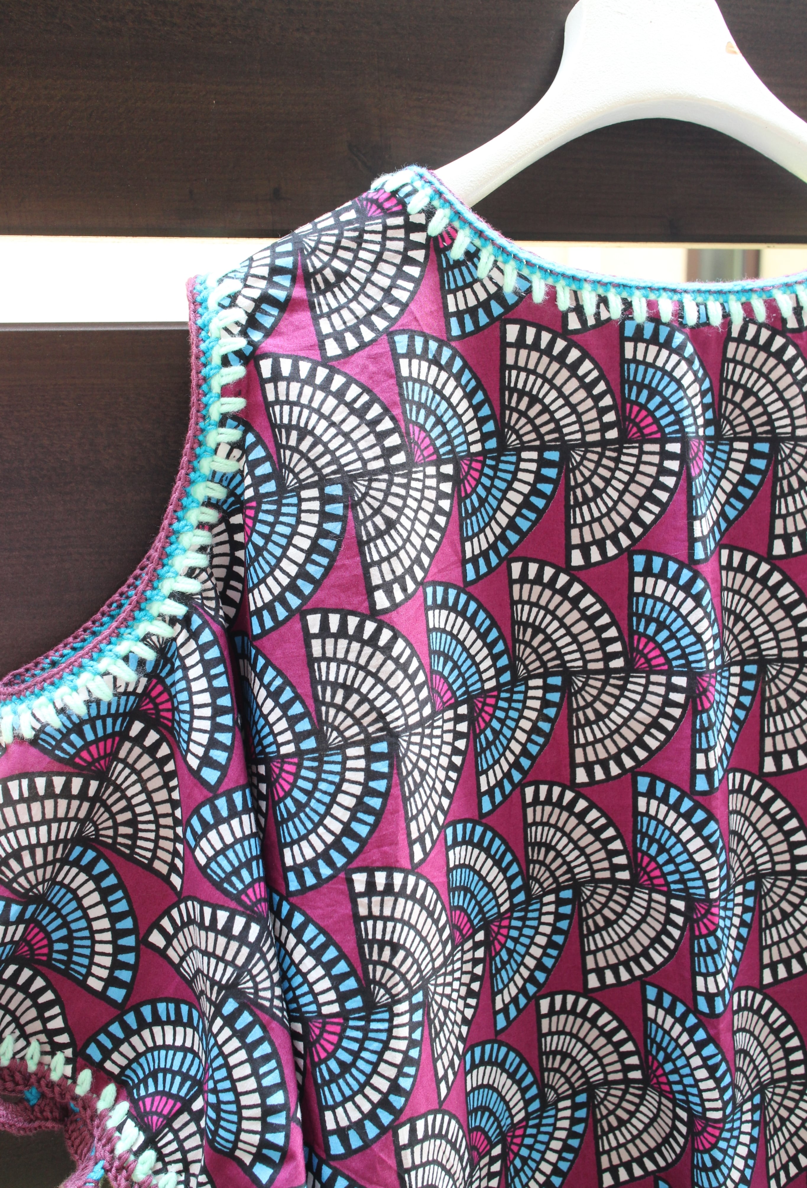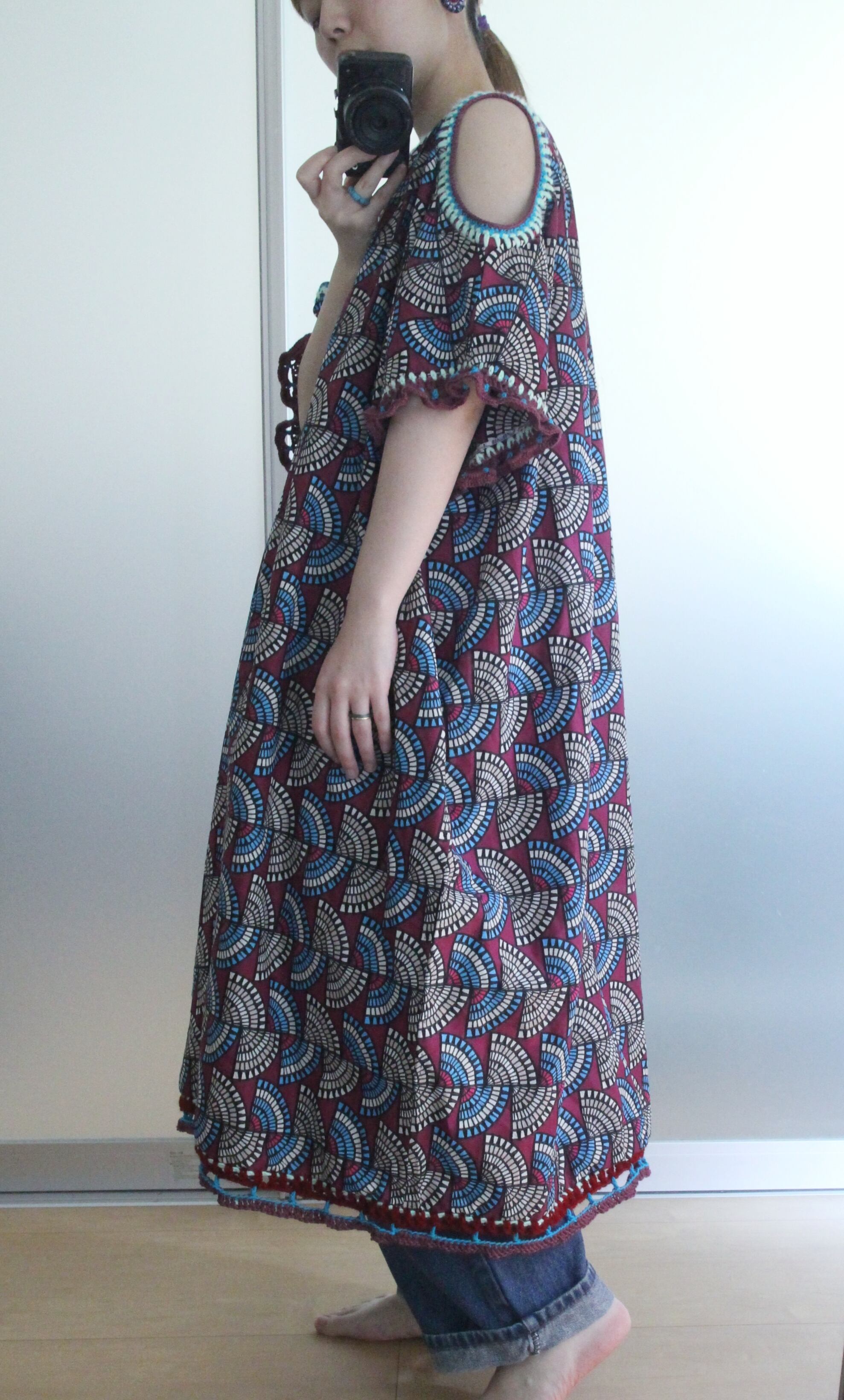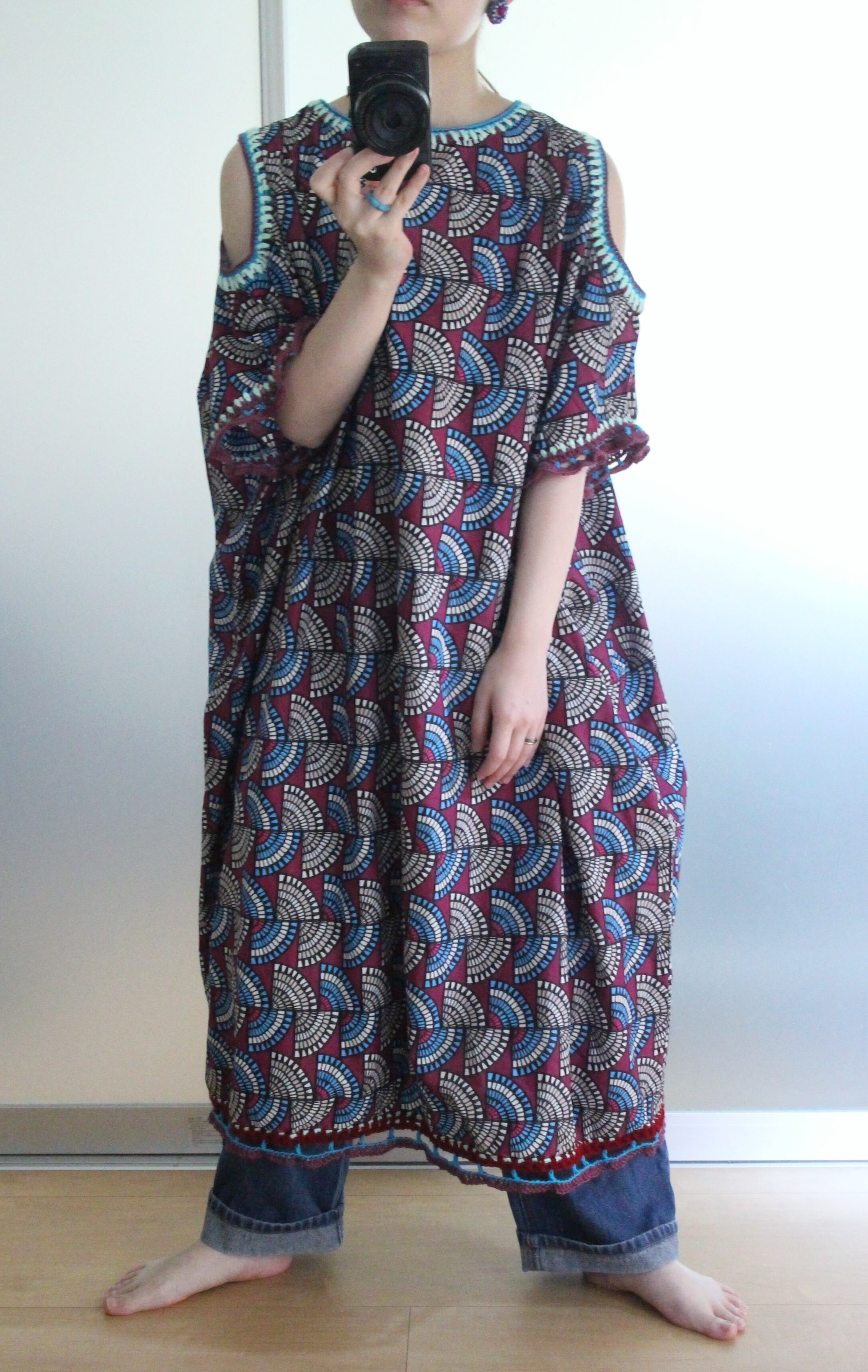 アフリカン的な幾何学模様の生地に装飾した肩開きワンピース◎