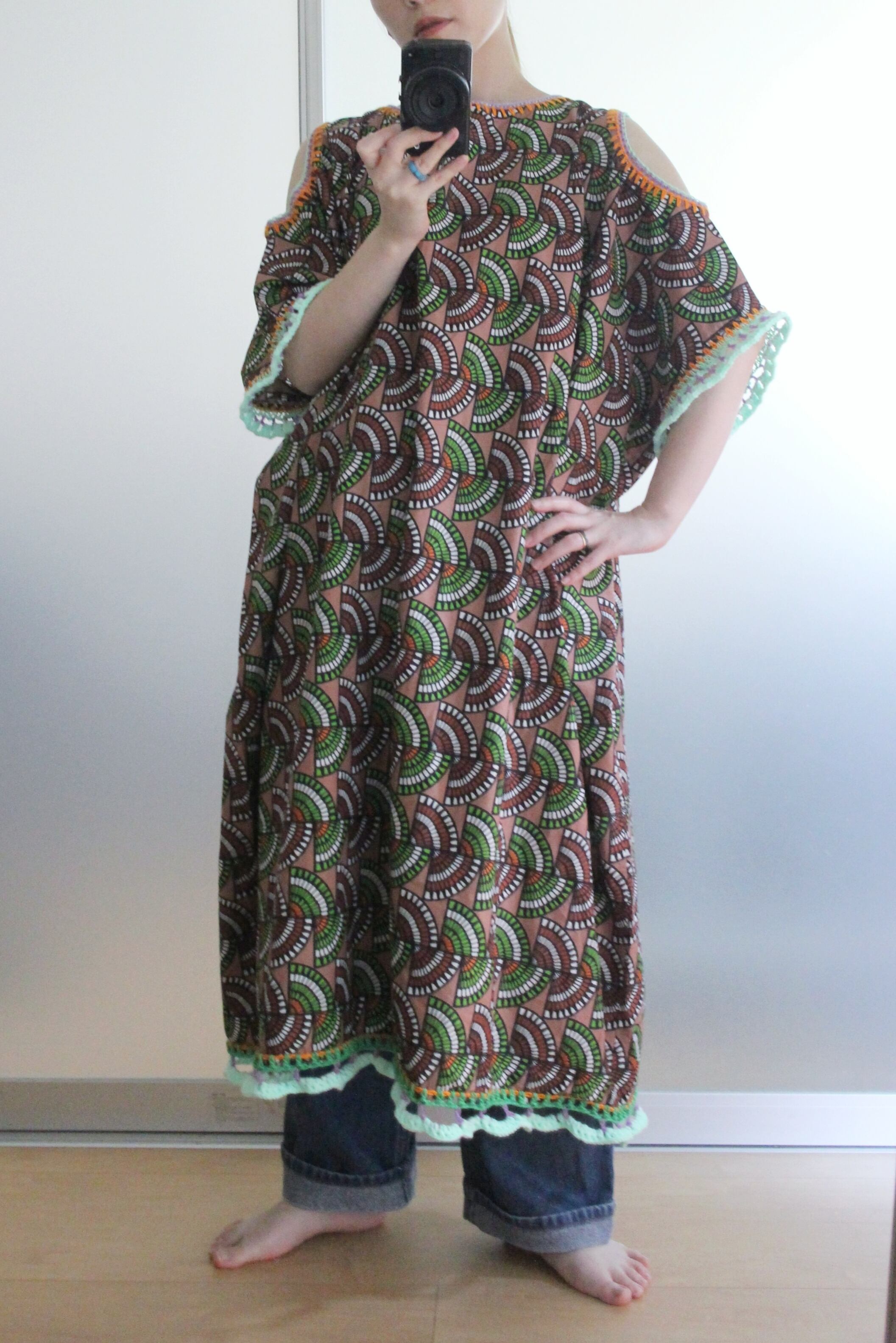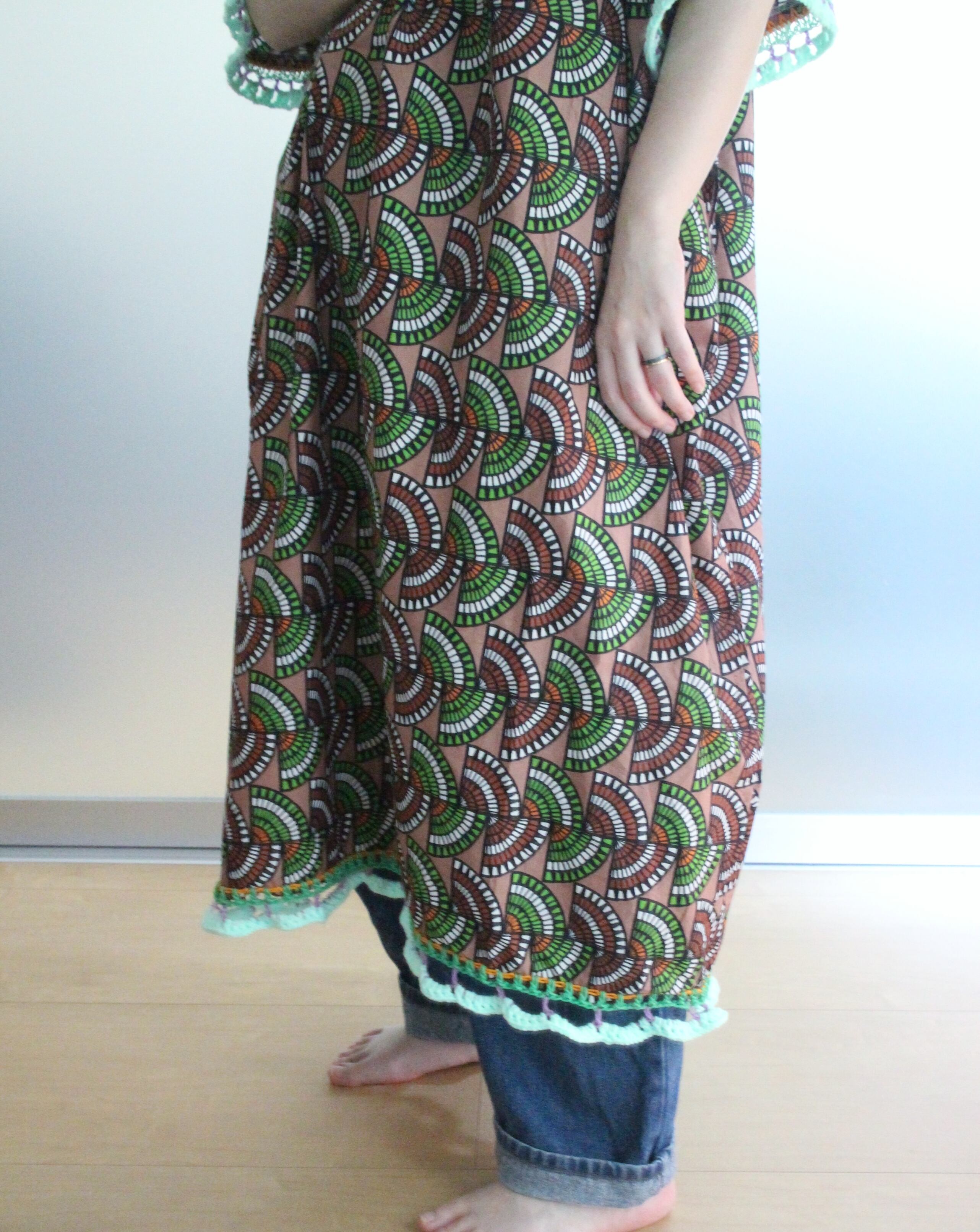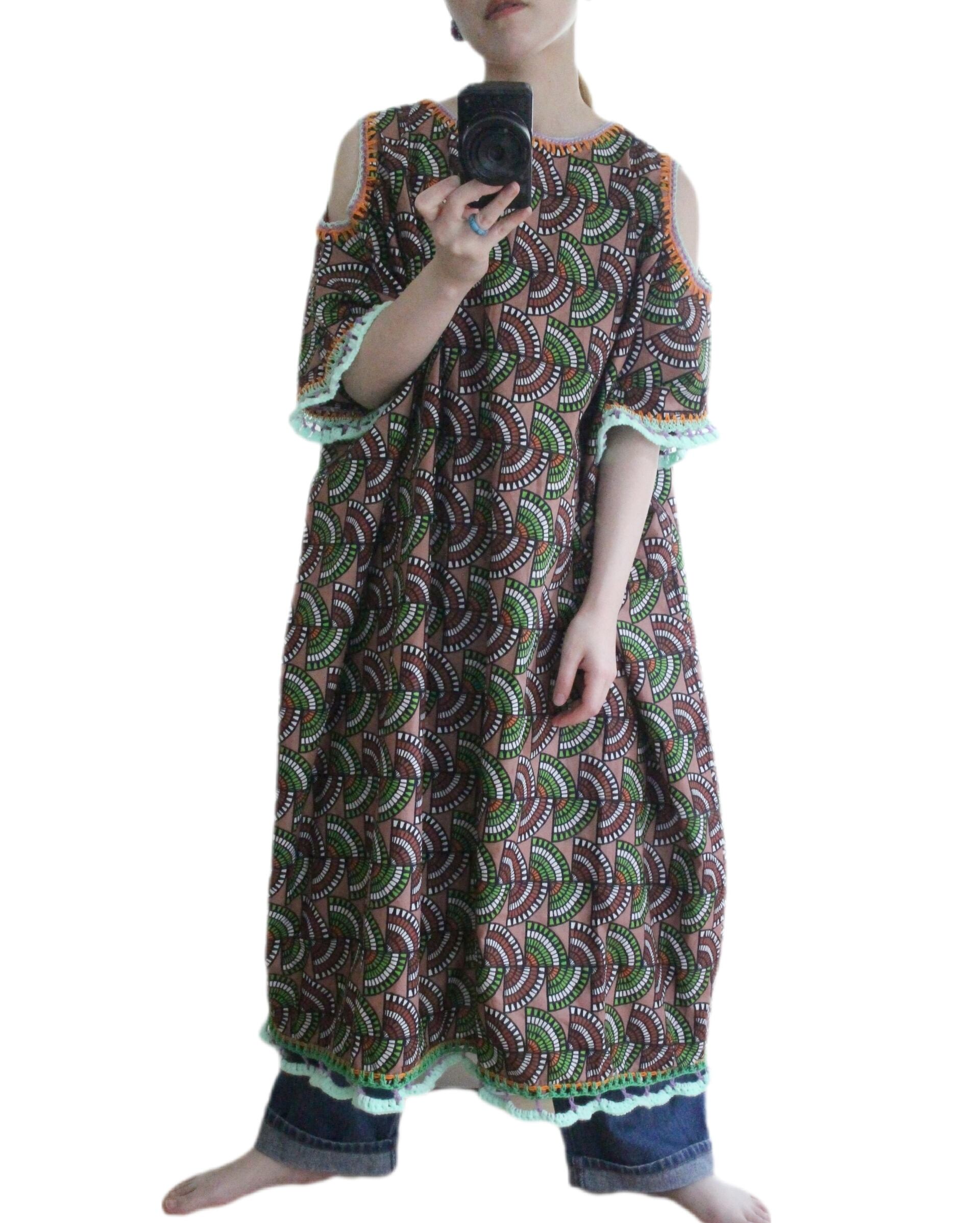 アフリカン的な幾何学模様の生地に装飾した肩開きワンピース◎