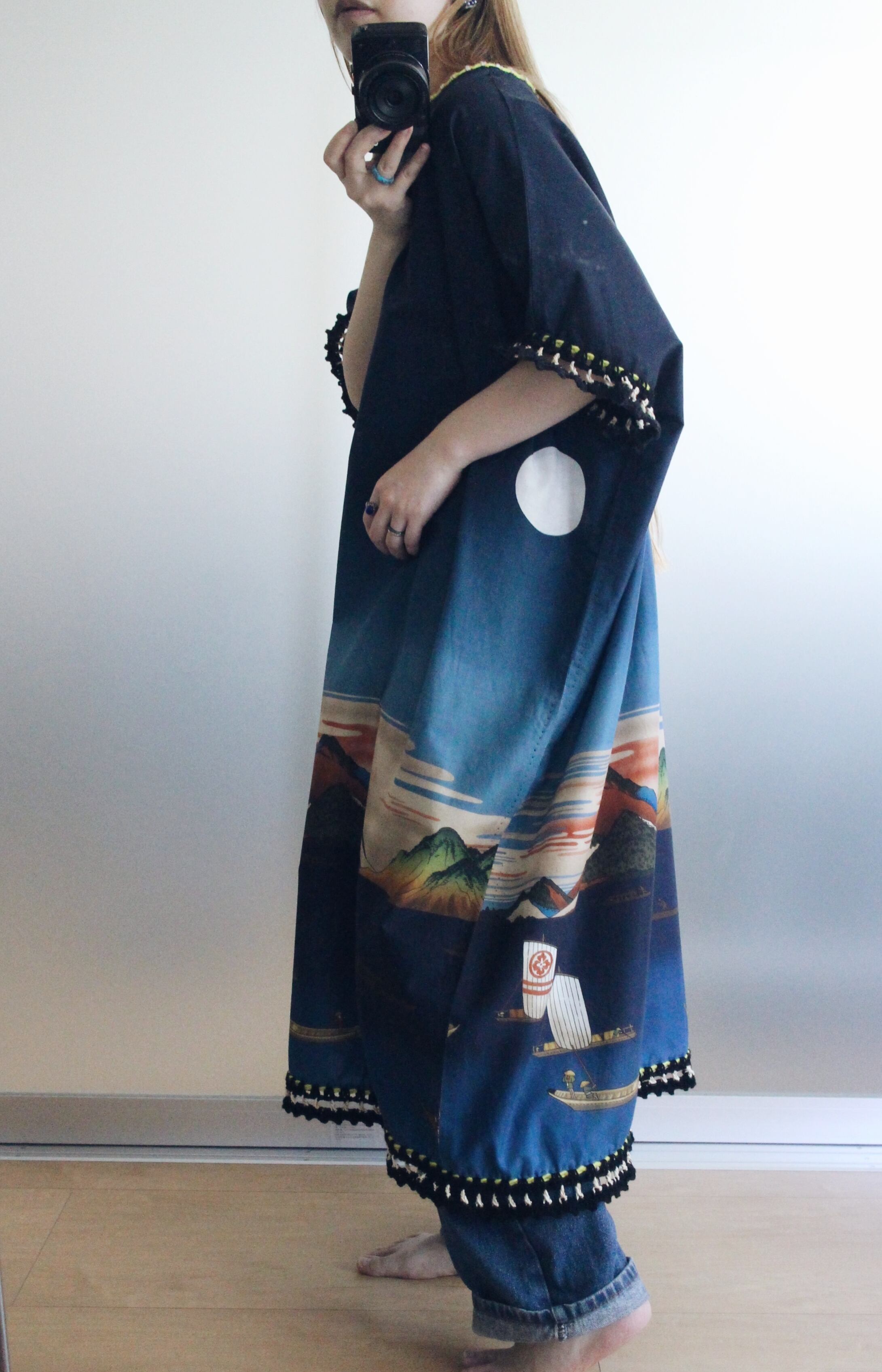 浮世絵柄の生地に装飾した現代的な和ワンピース◎