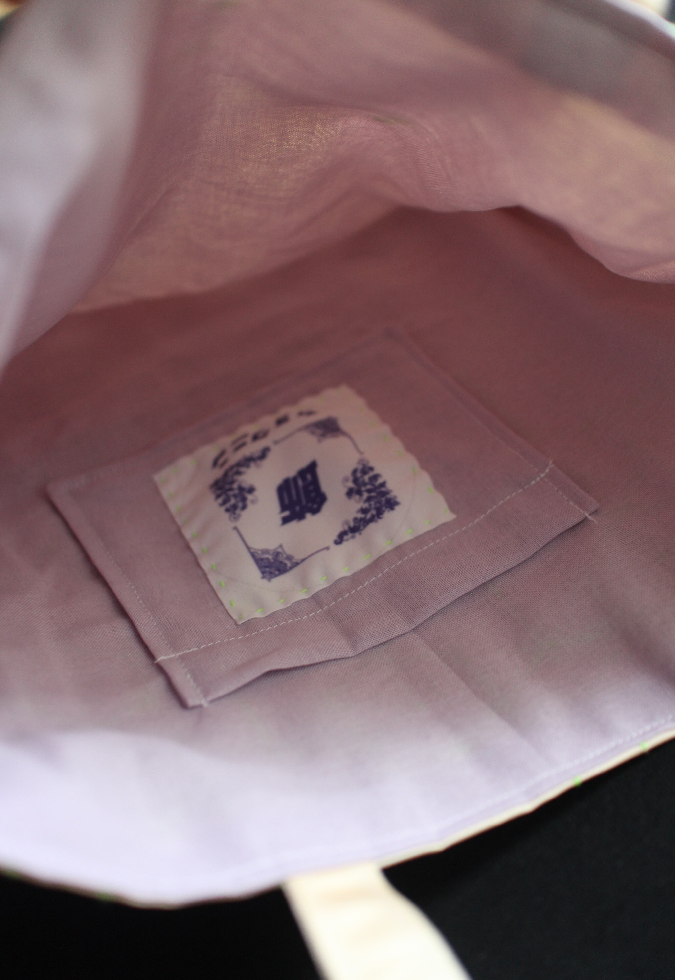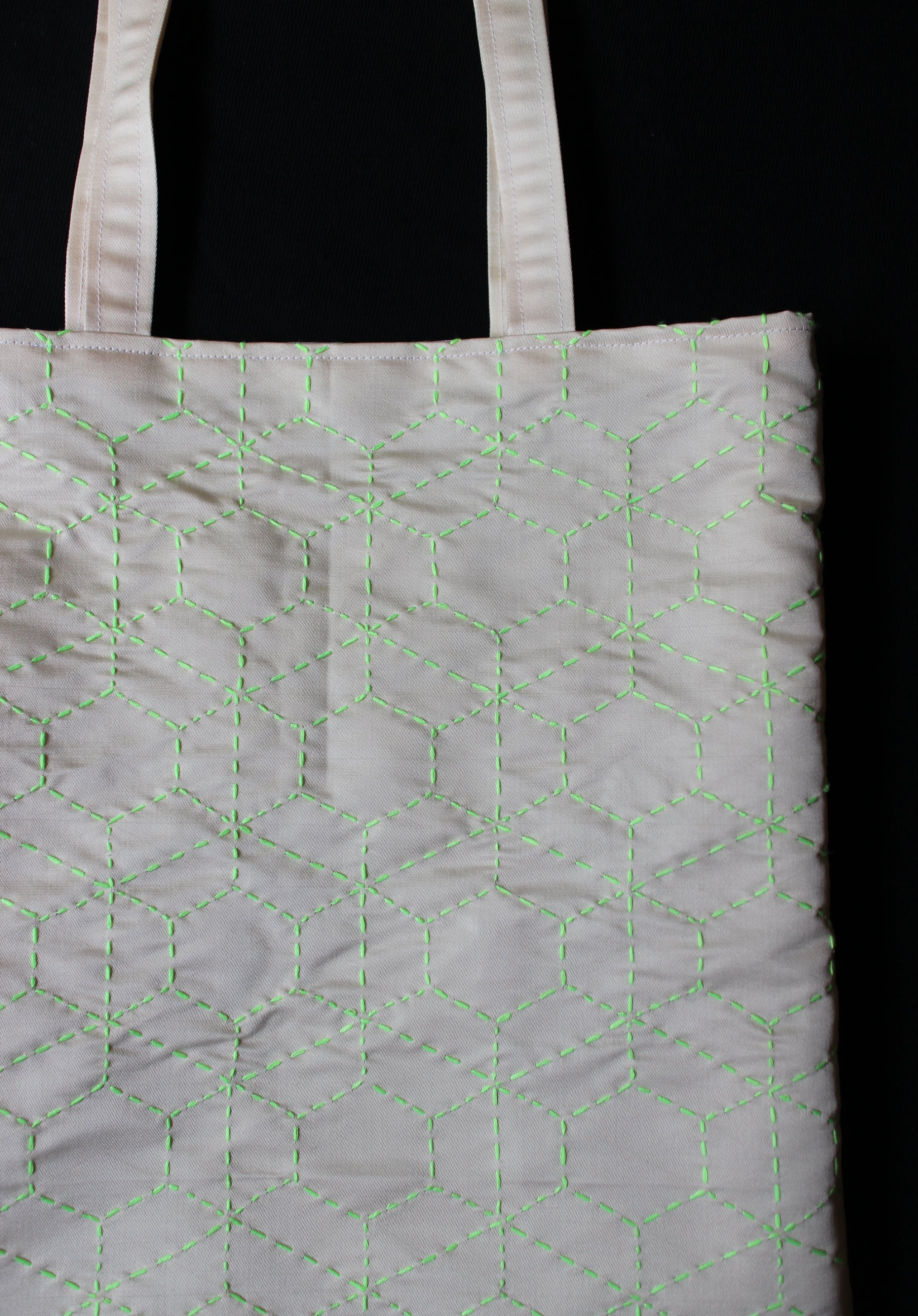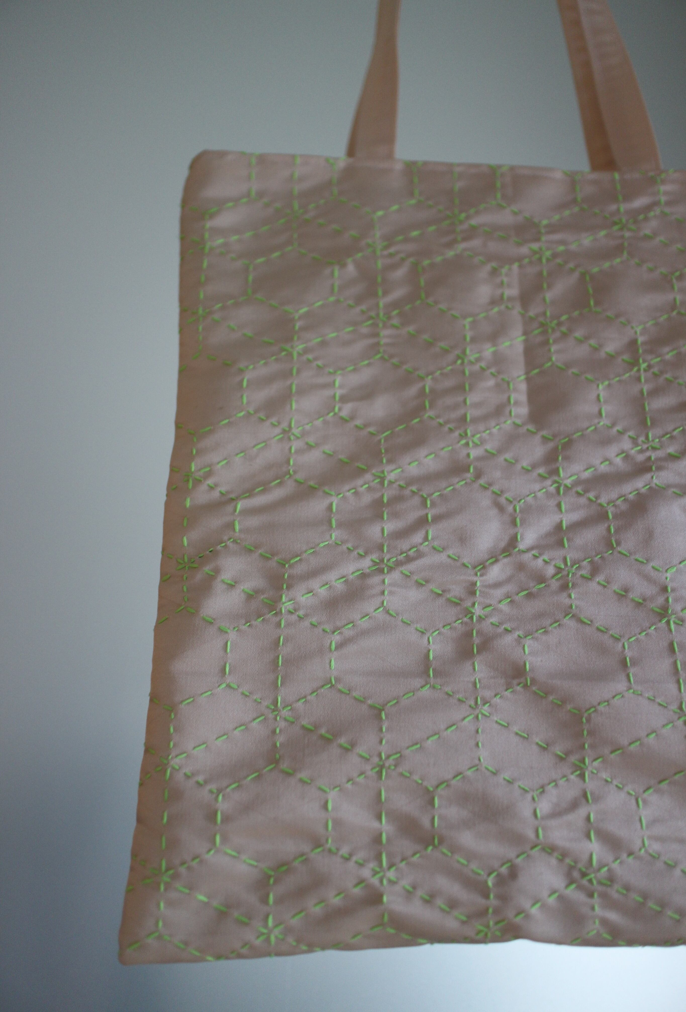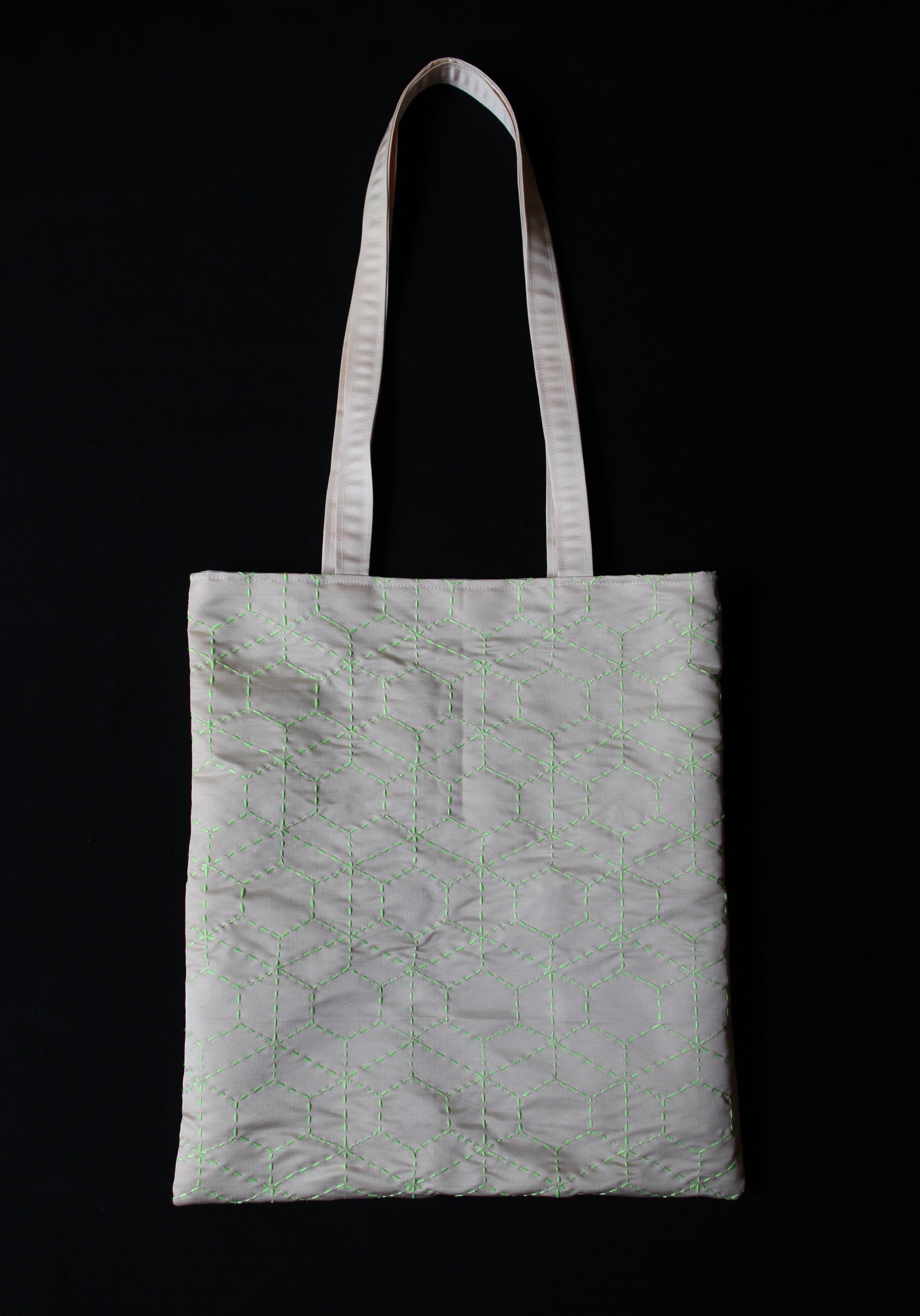 落ち着いた色味の帯地に、ネオンカラーの糸で刺し子を施したトートバッグです。