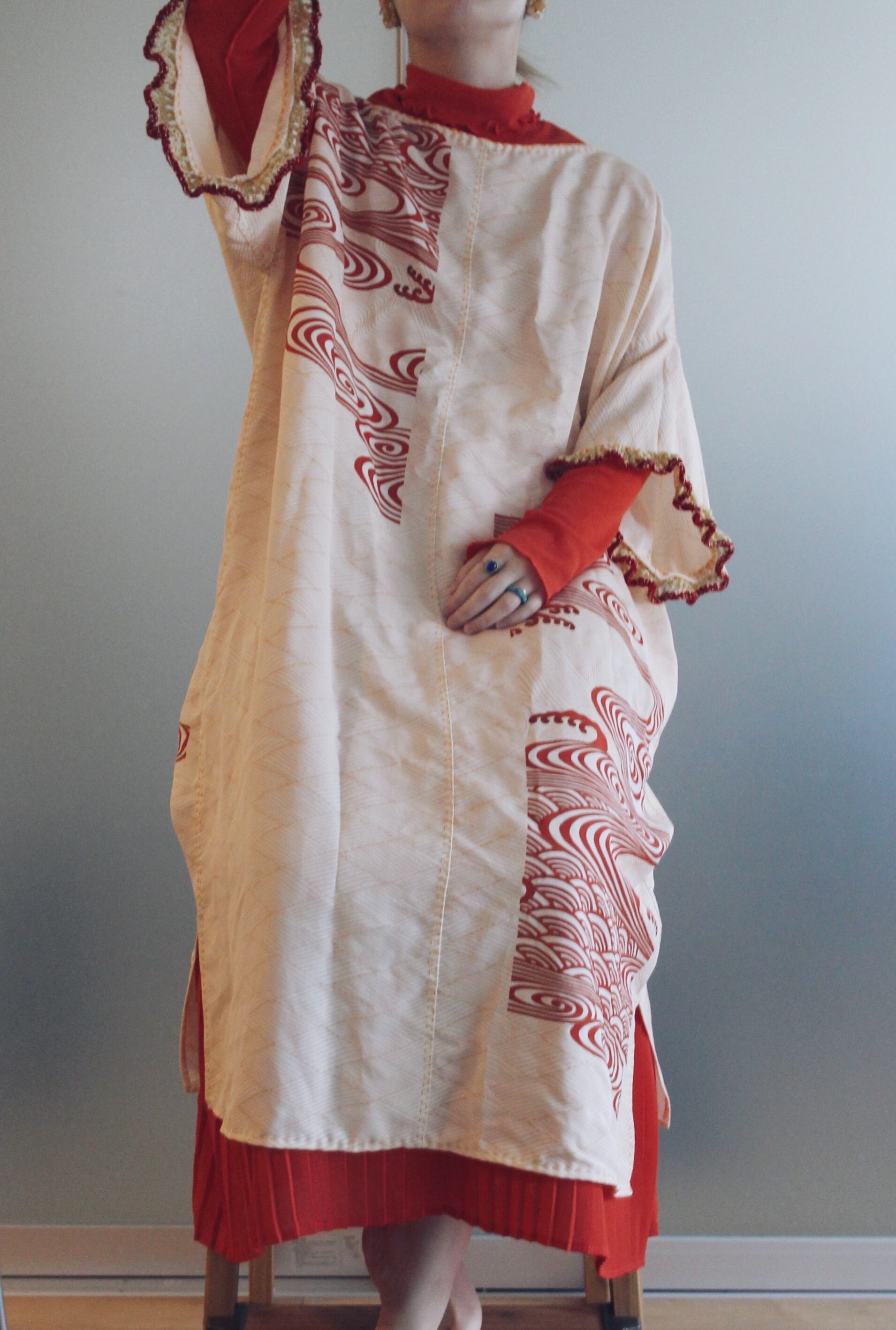 ヴィンテージの着物生地で製作したリメイクワンピースです。