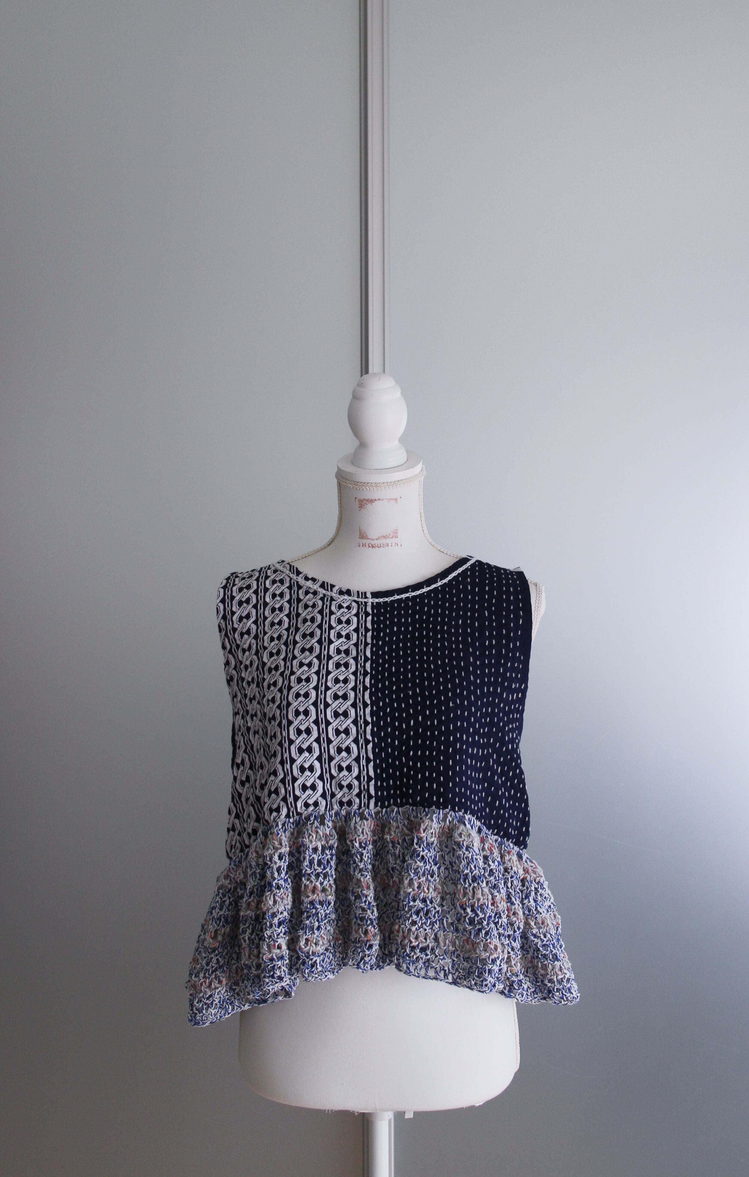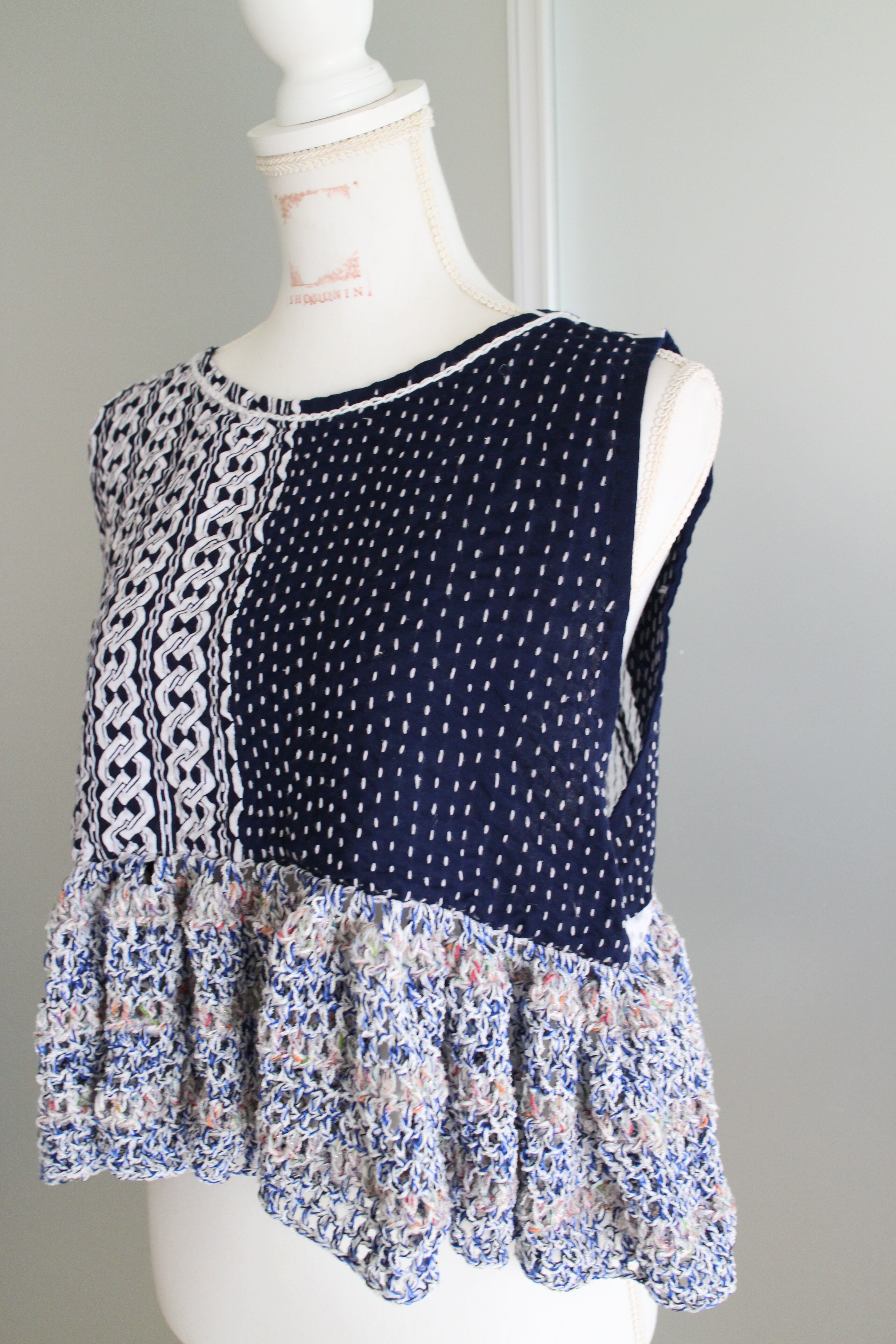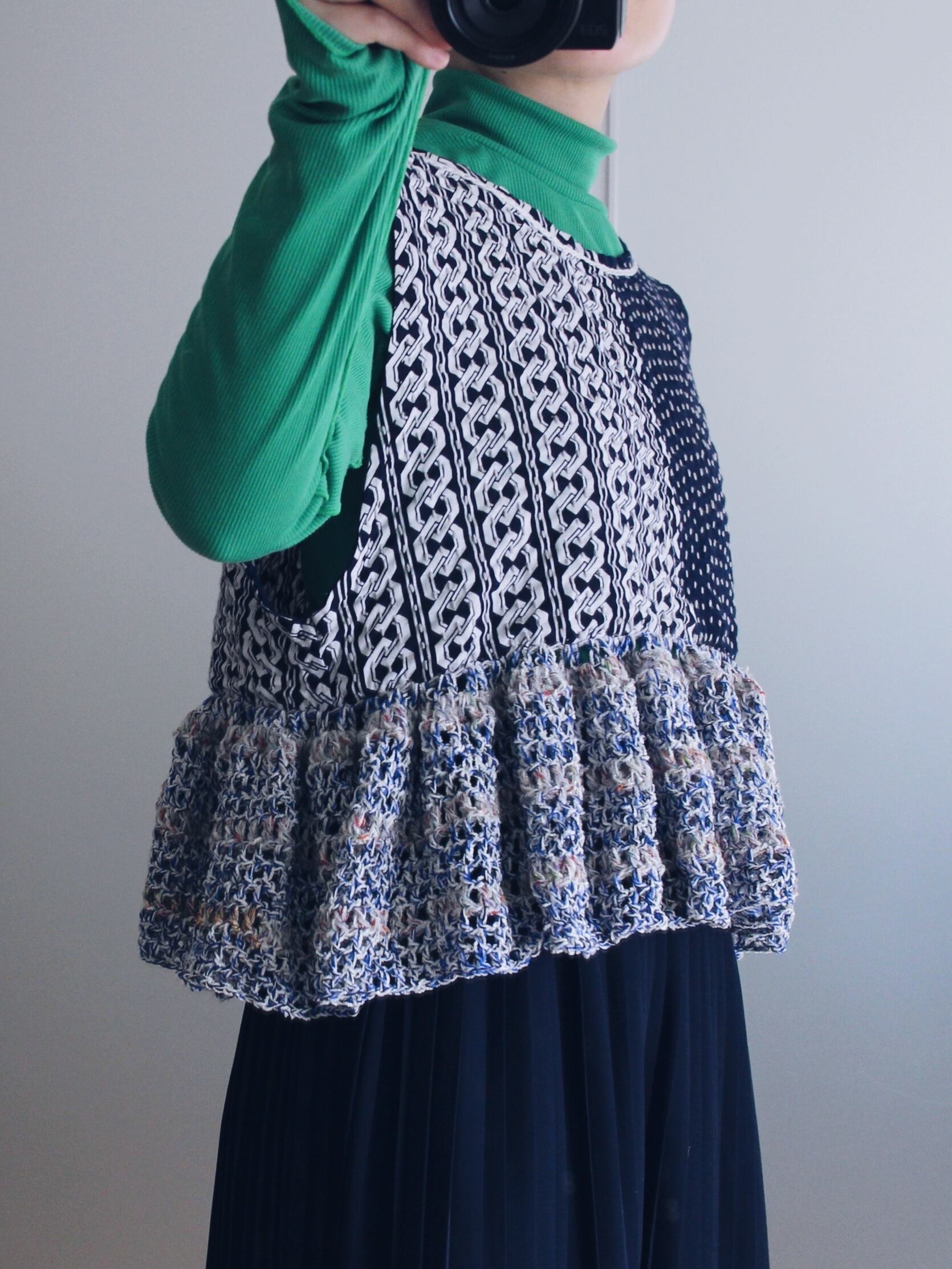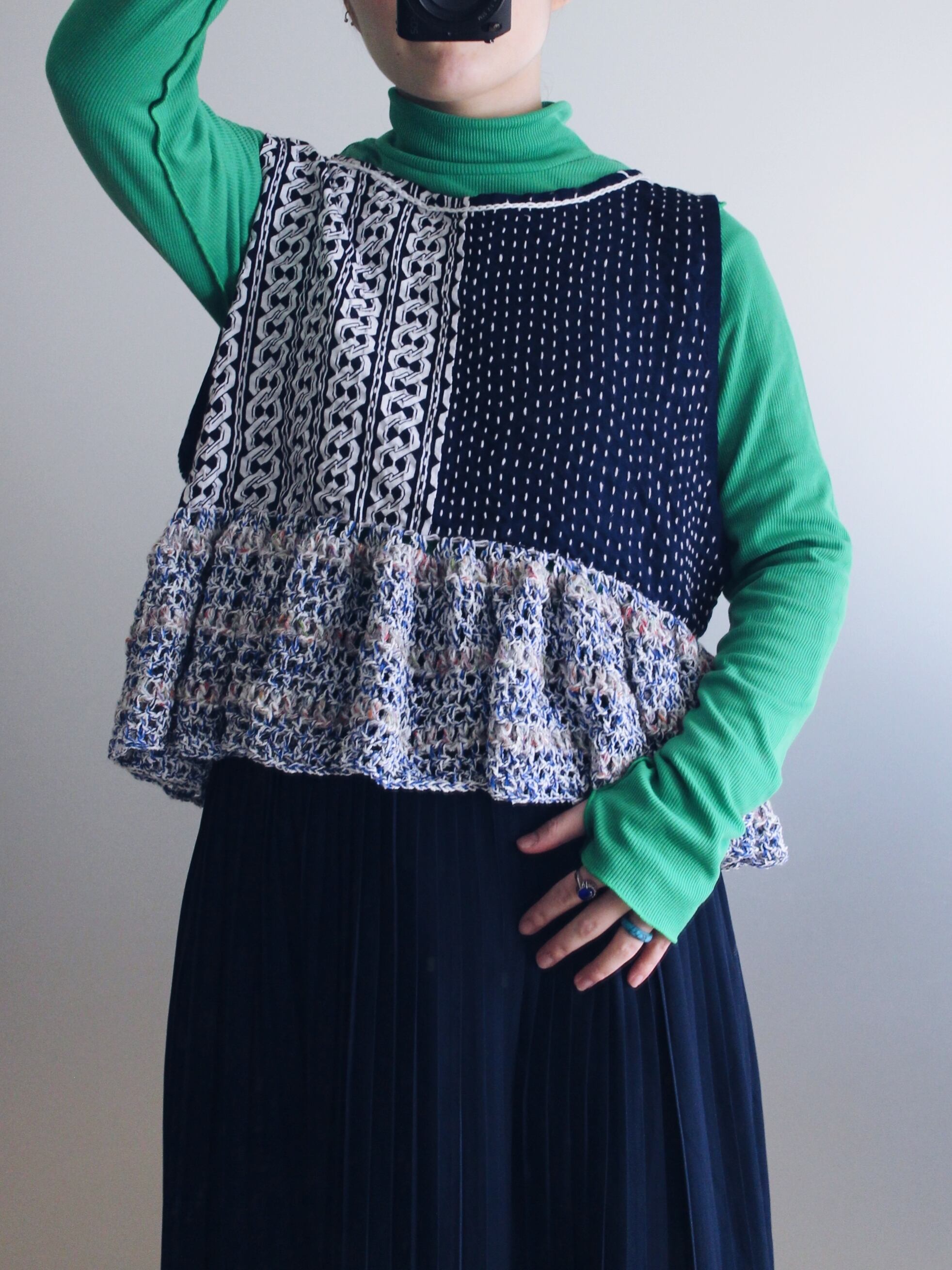 ヴィンテージの浴衣生地とたっぷりの毛糸で製作したリメイクノースリーブです。