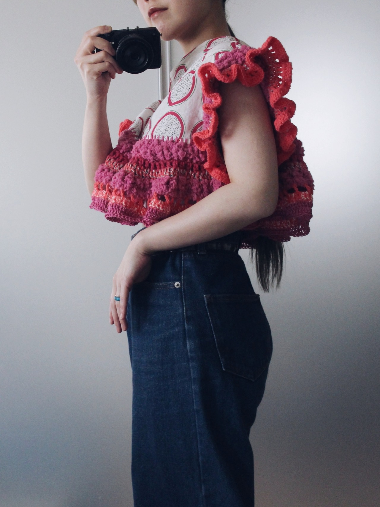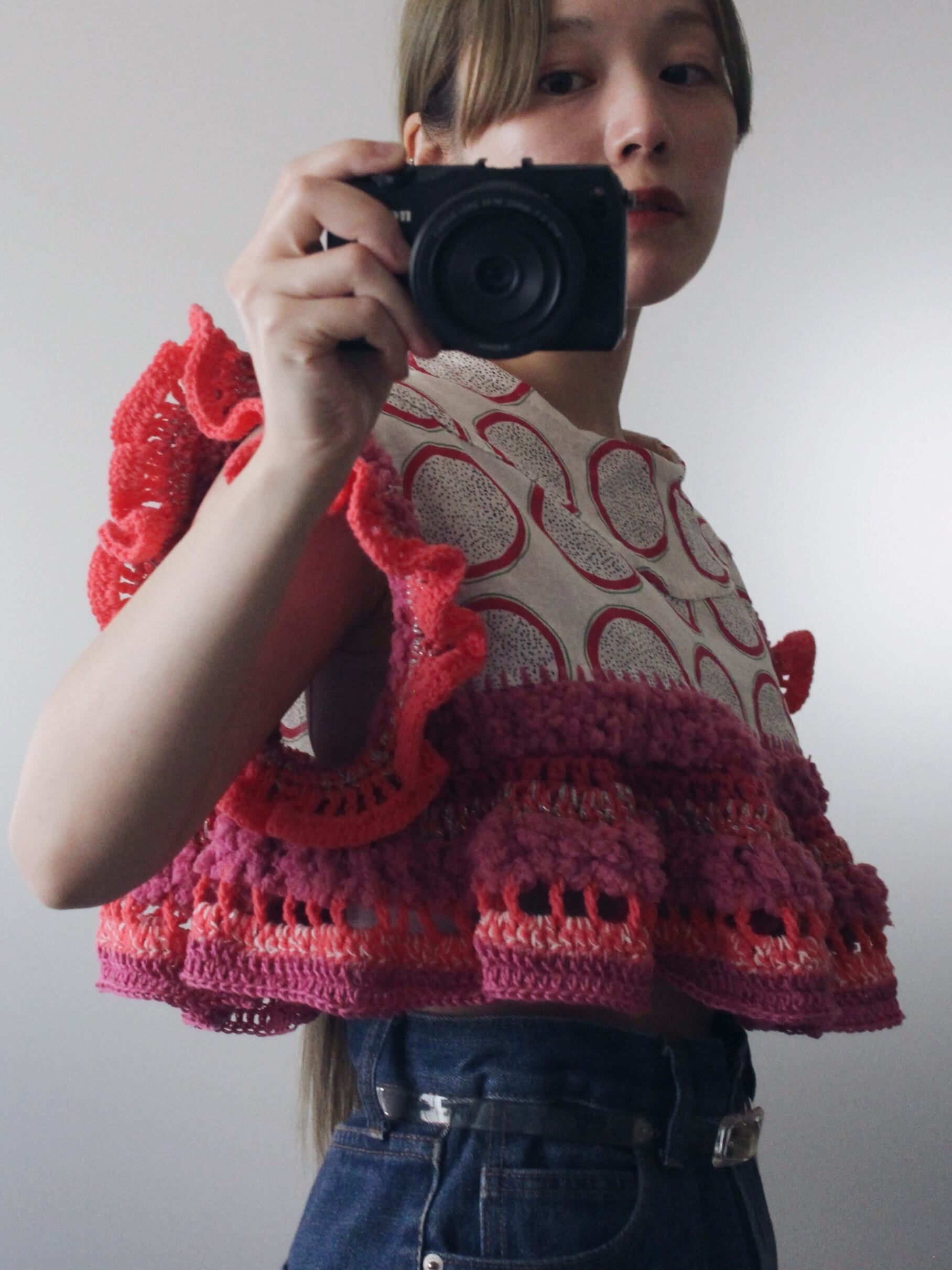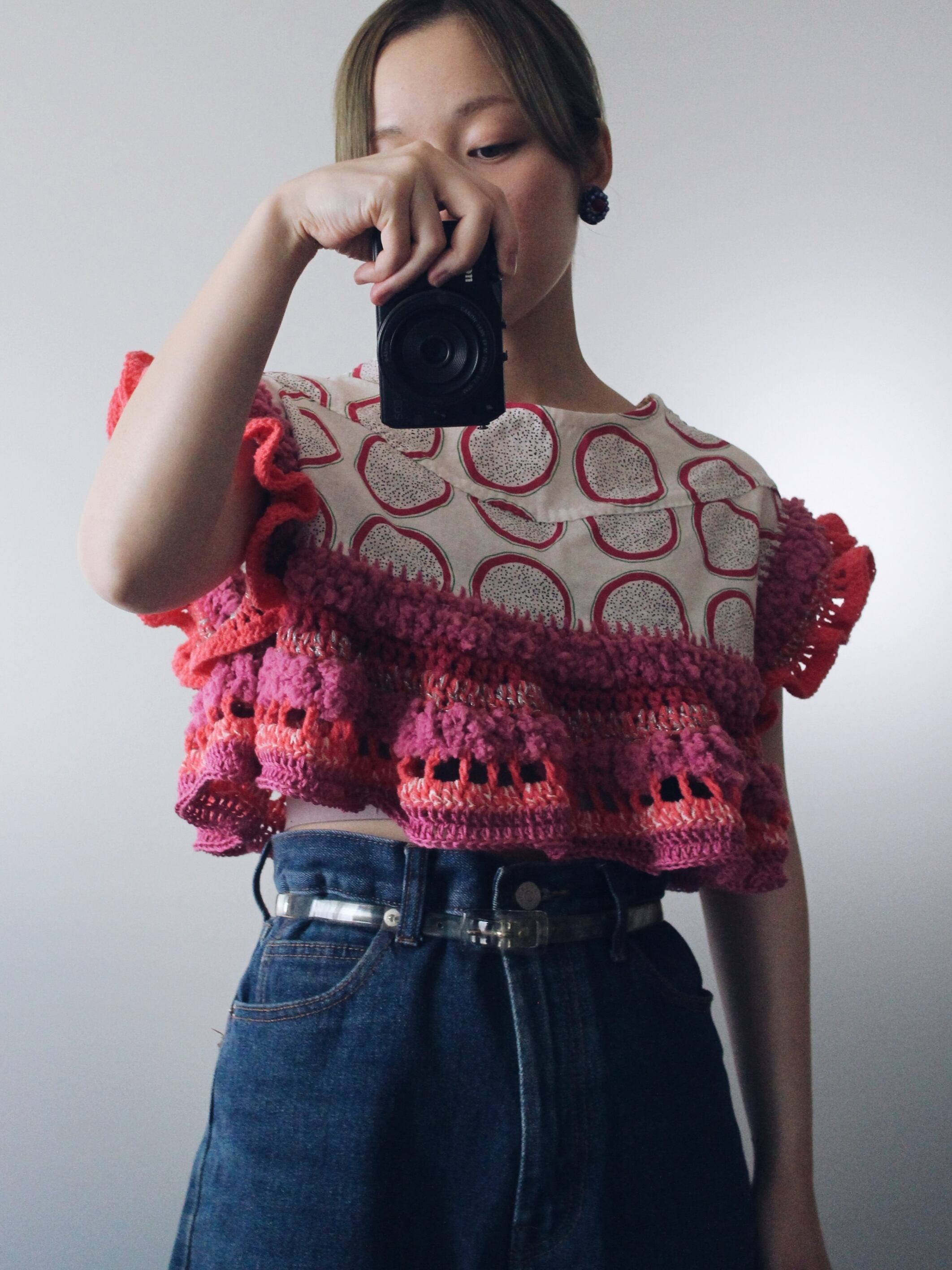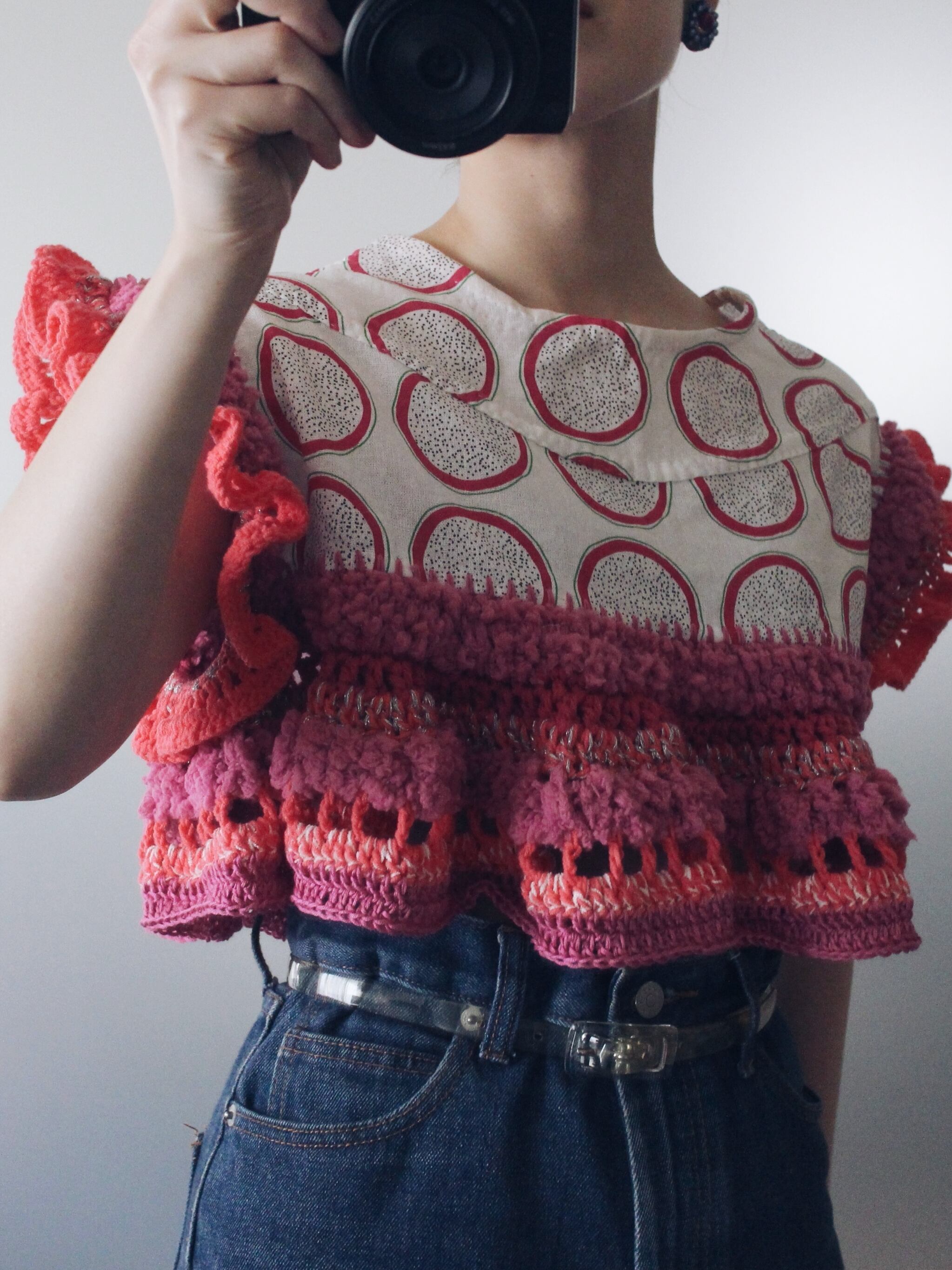 ドラゴンフルーツの輪切り柄生地をたっぷりの毛糸で装飾したトップス