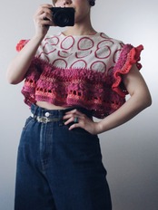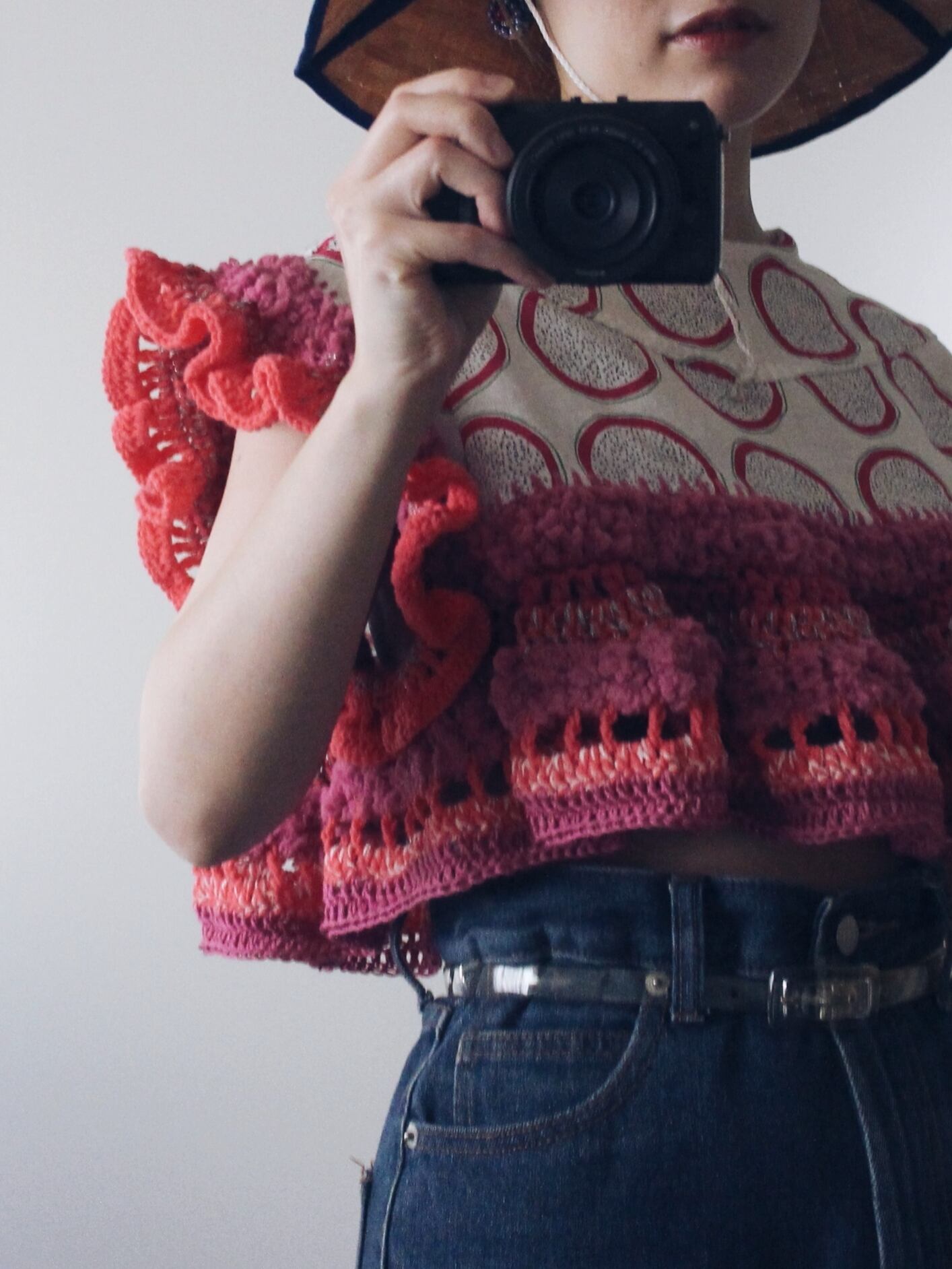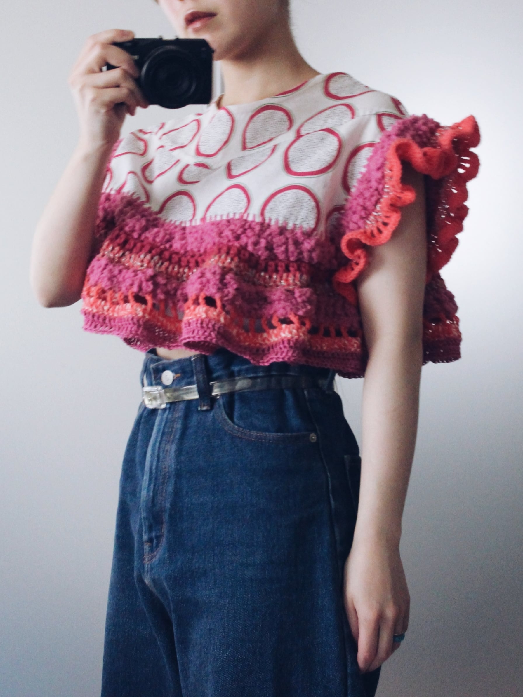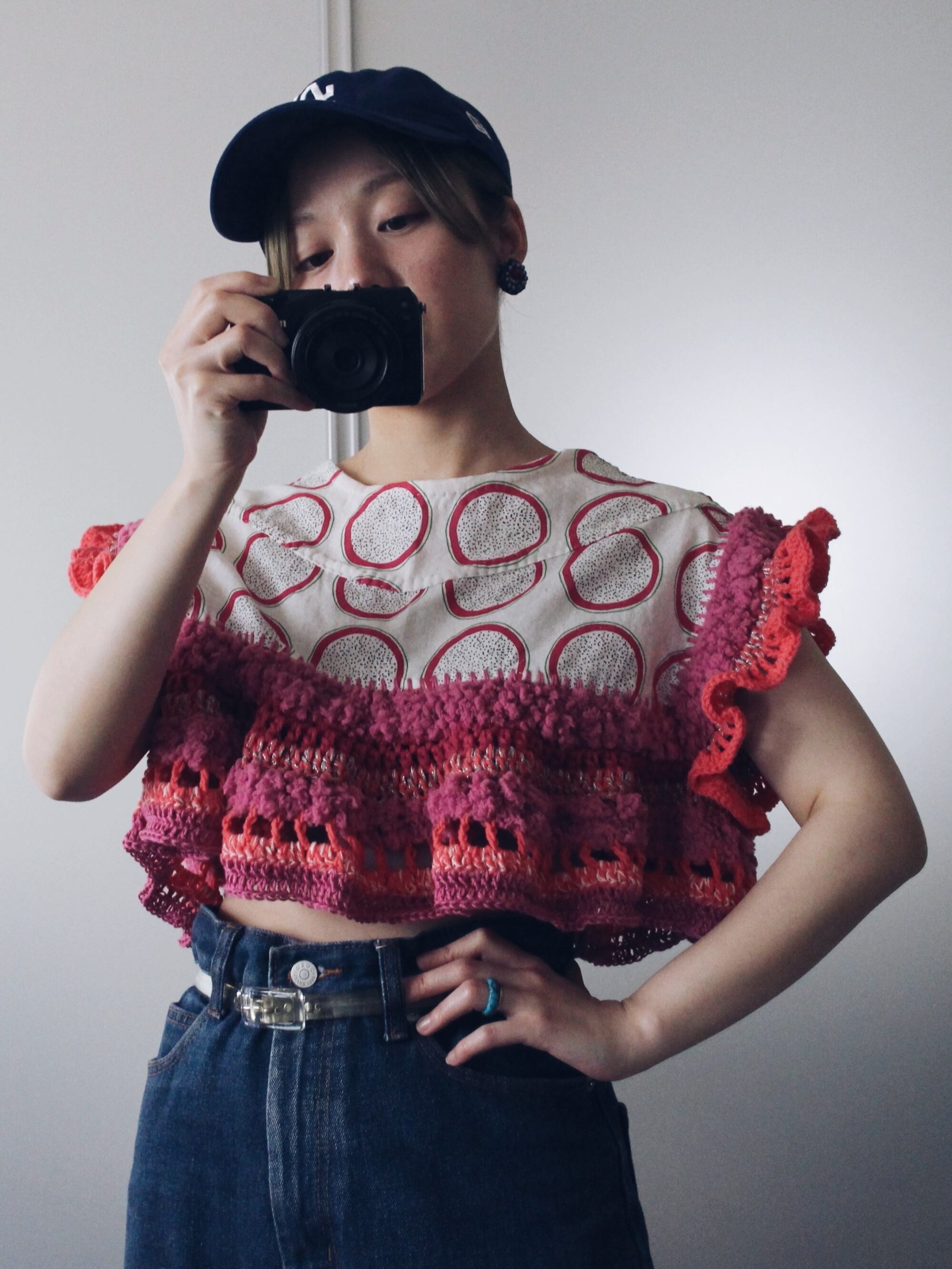 ドラゴンフルーツの輪切り柄生地をたっぷりの毛糸で装飾したトップス