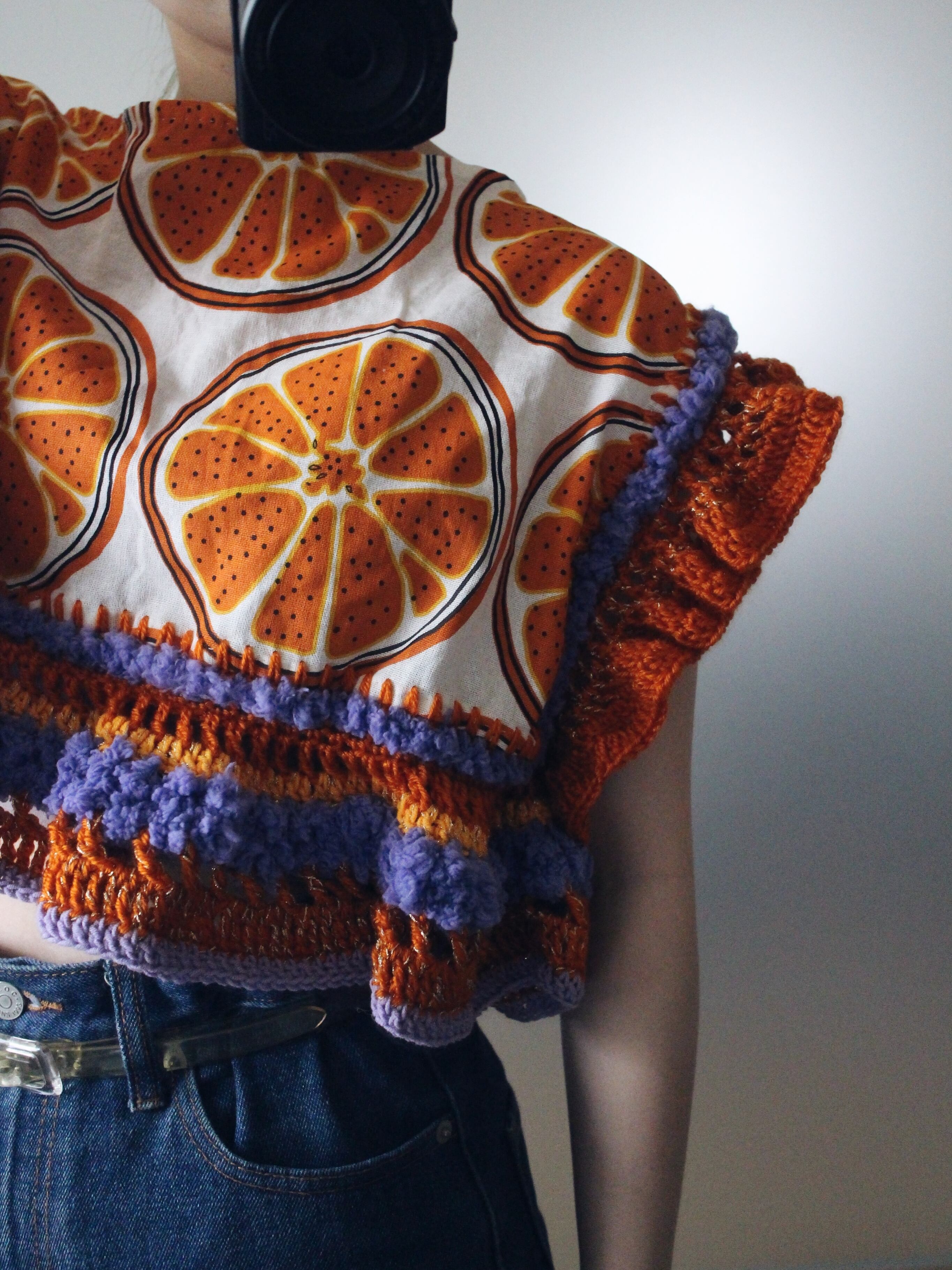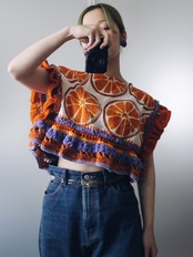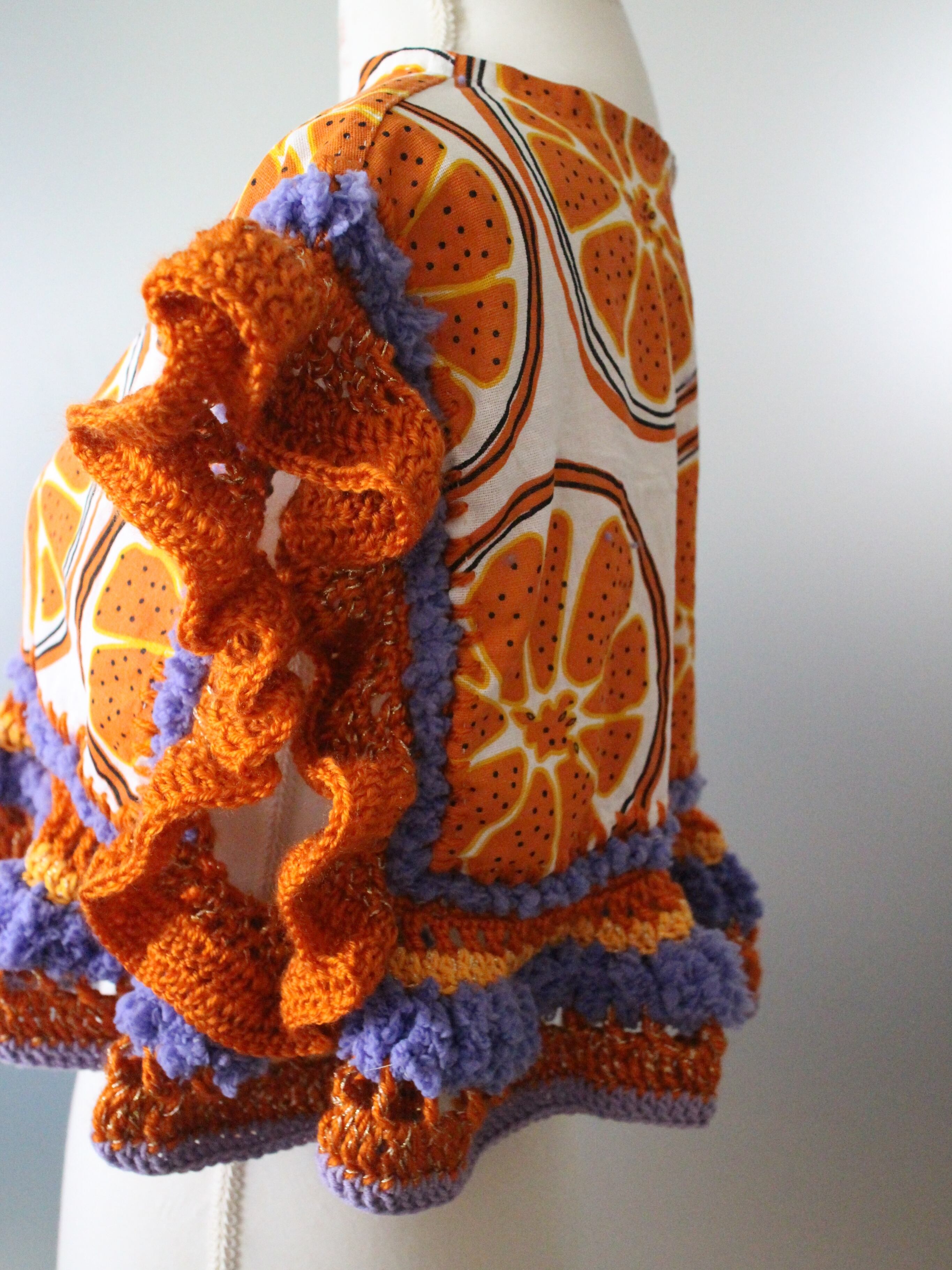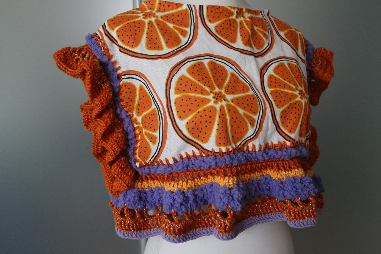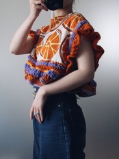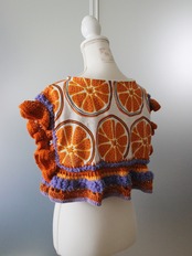 オレンジの輪切り柄生地をたっぷりの毛糸で装飾したトップス