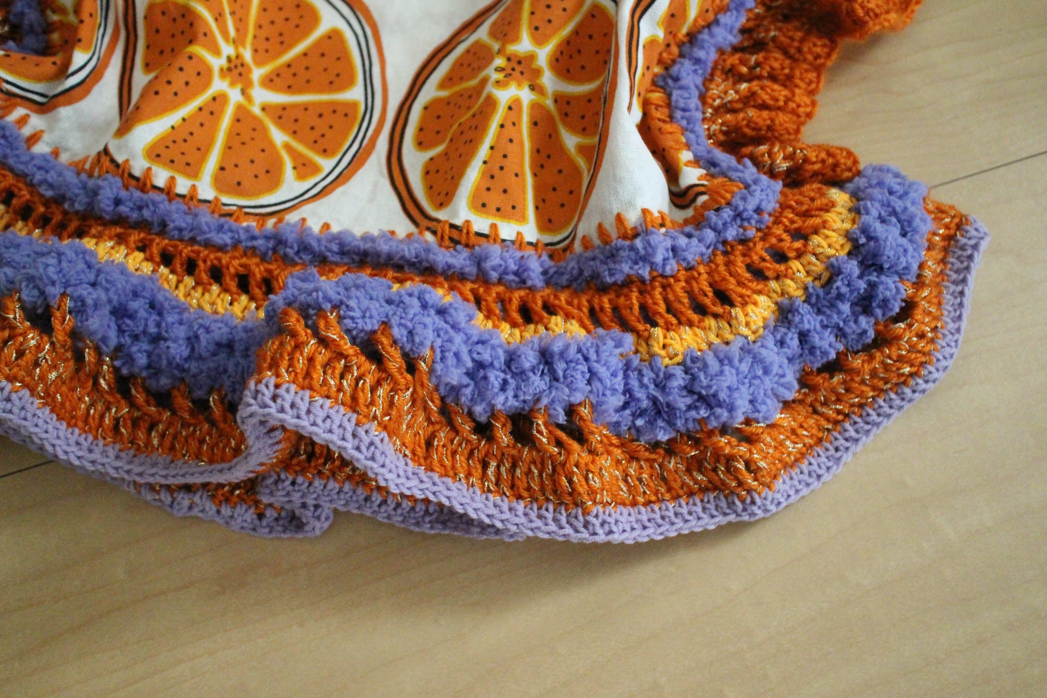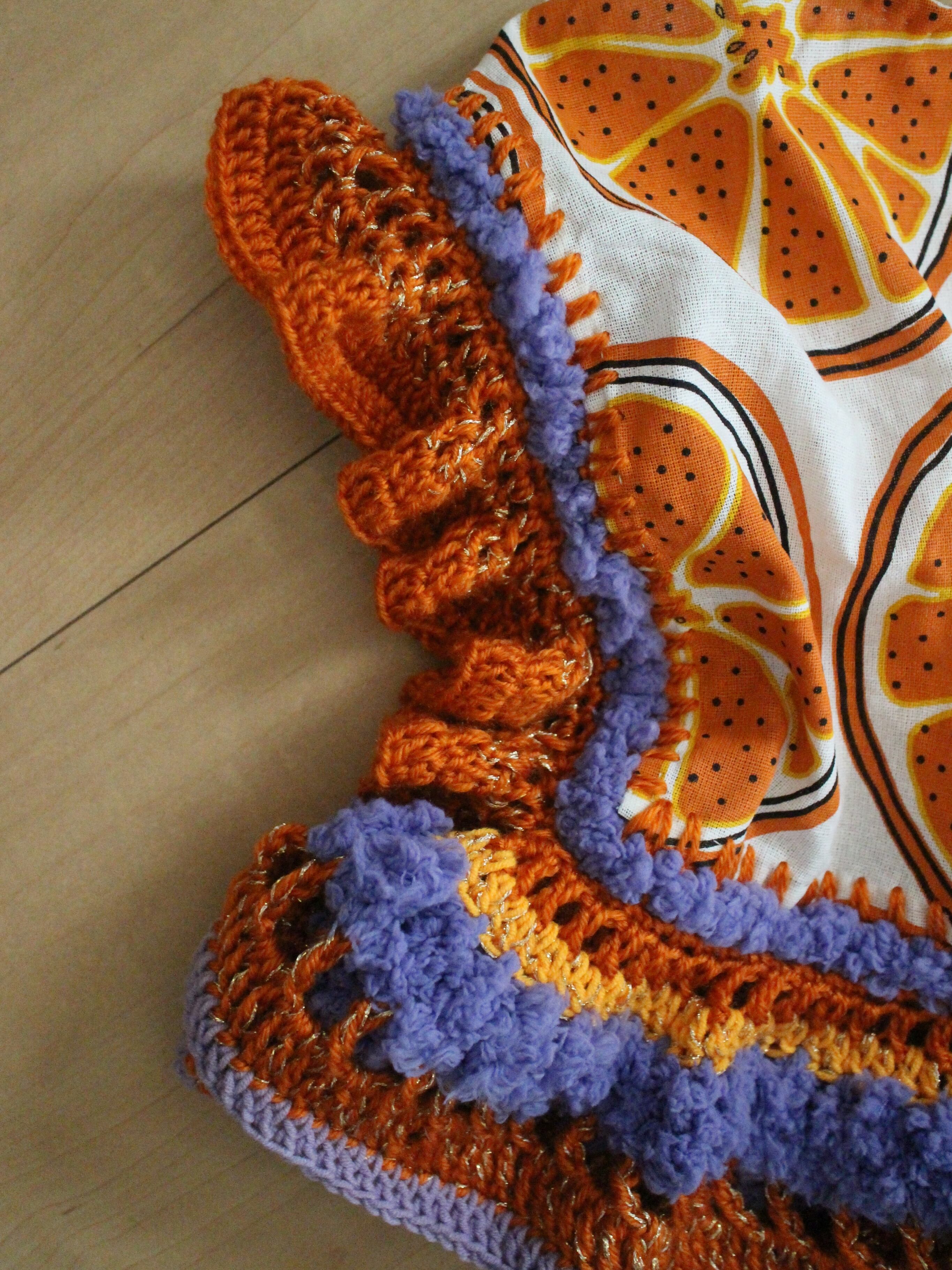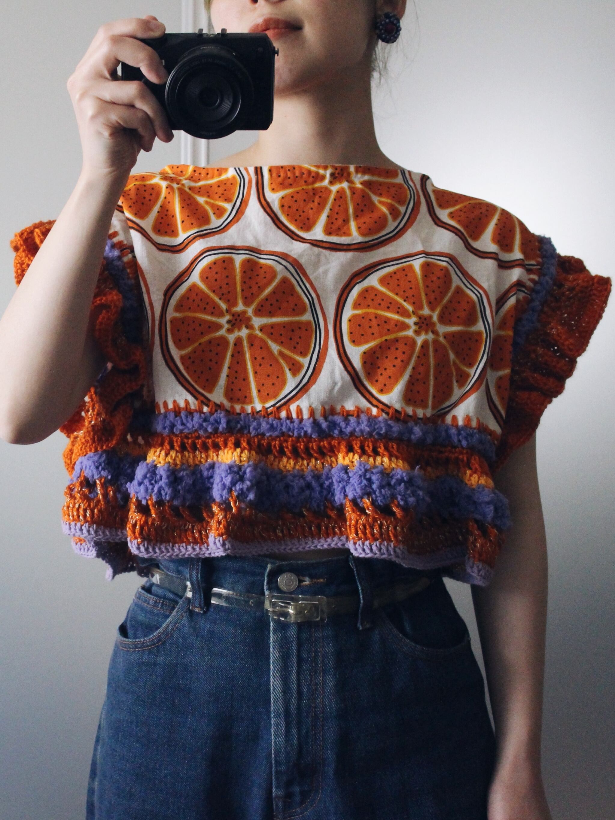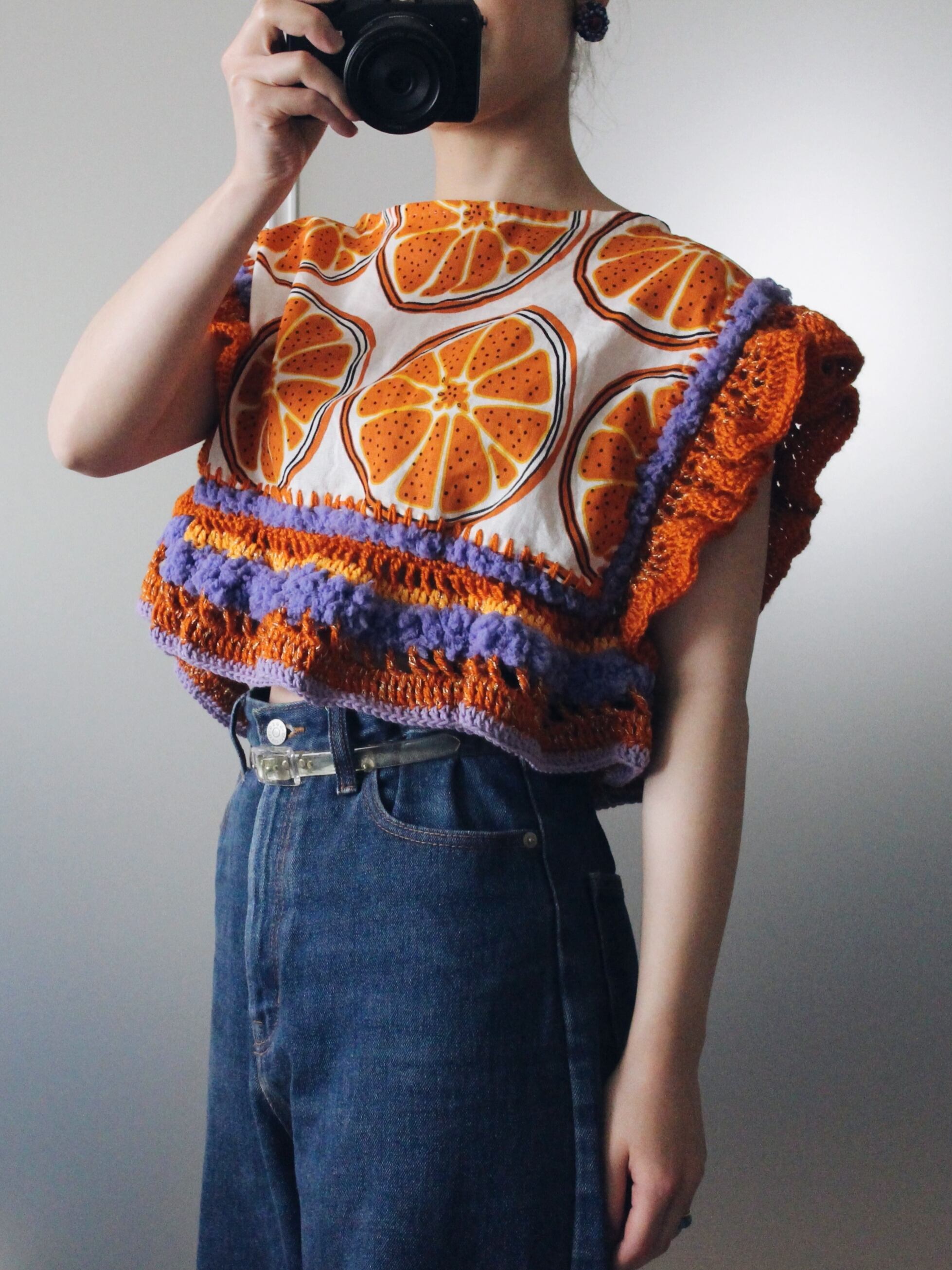 オレンジの輪切り柄生地をたっぷりの毛糸で装飾したトップス