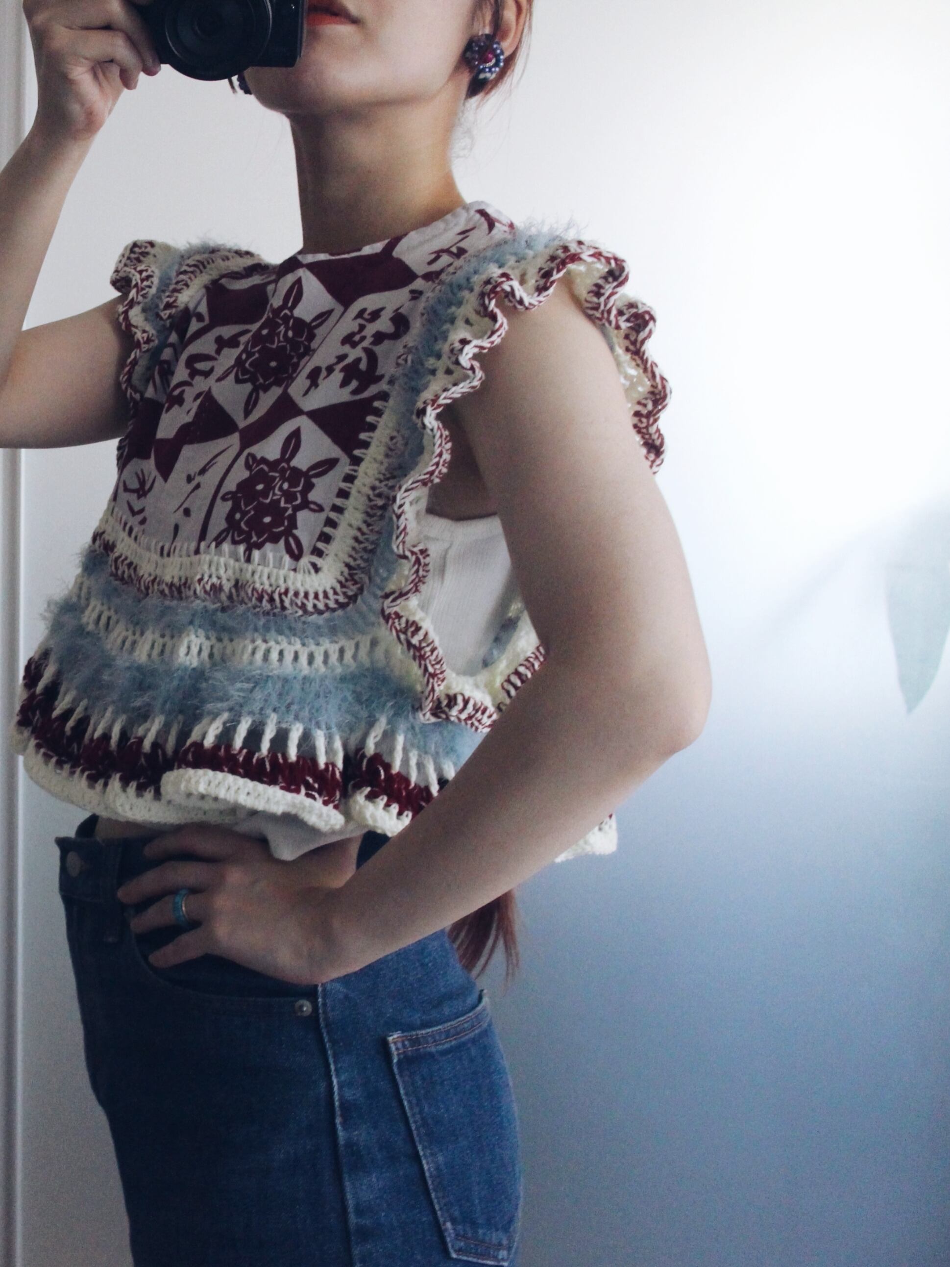 浴衣生地をたっぷりの毛糸で装飾したトップス