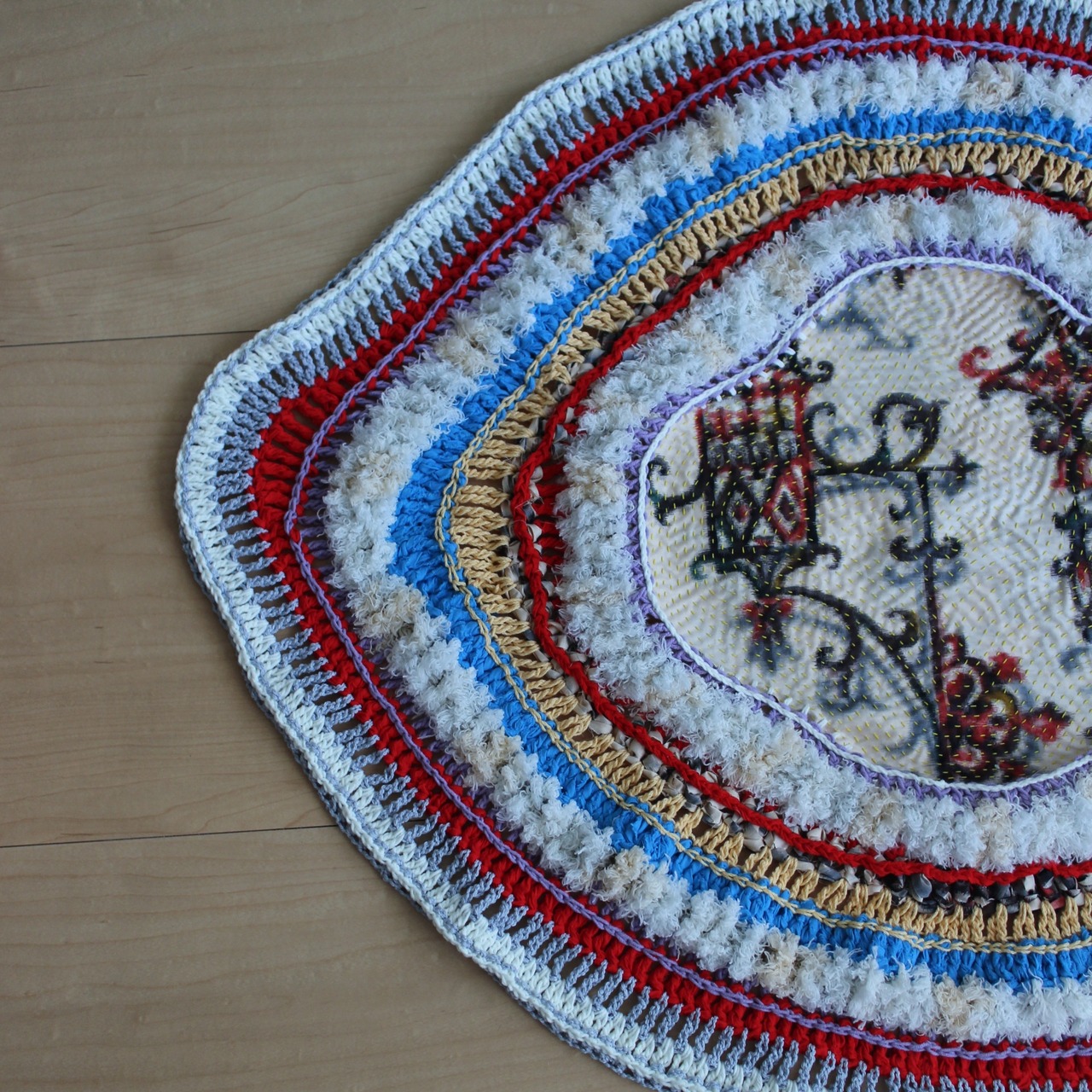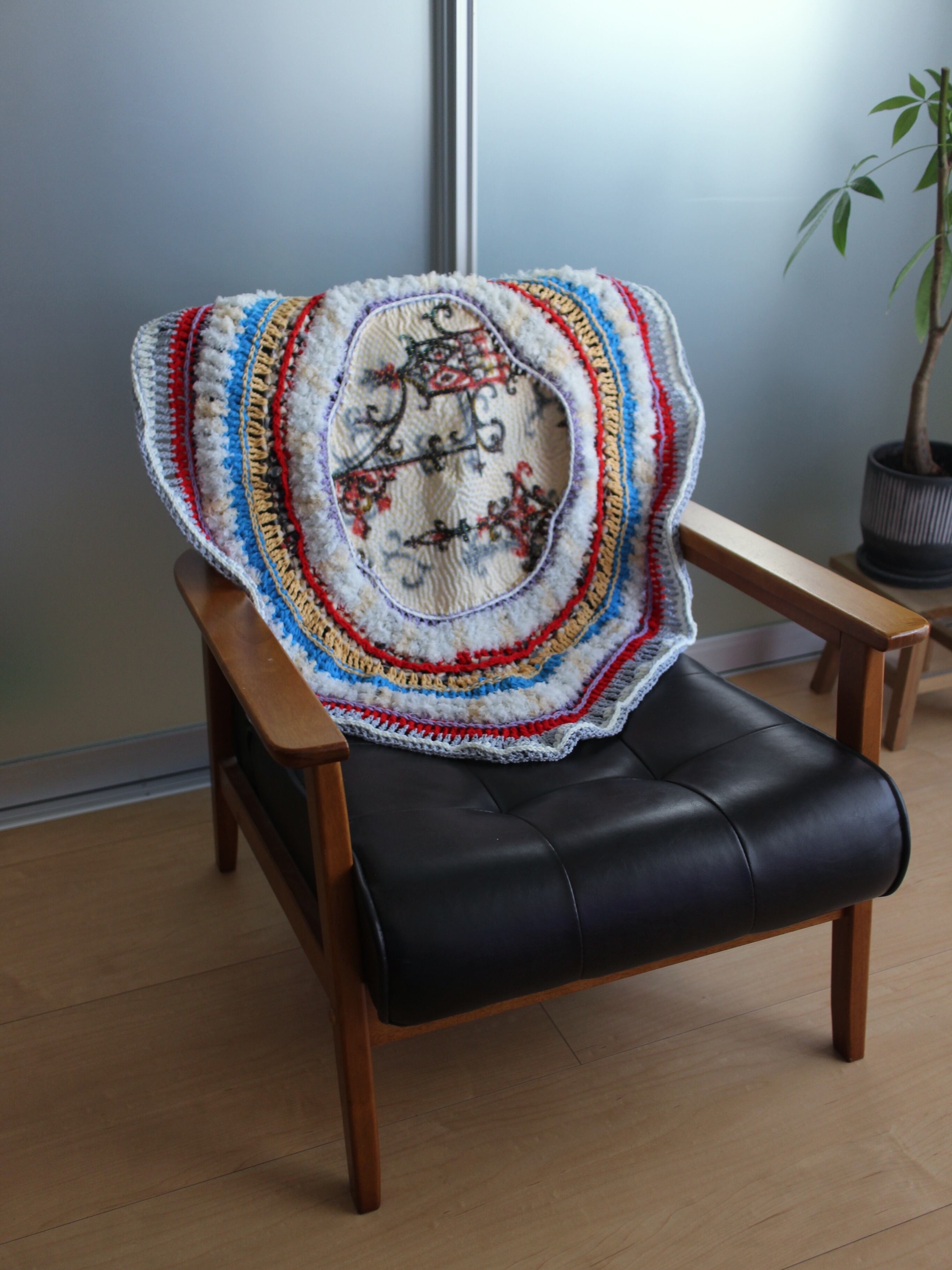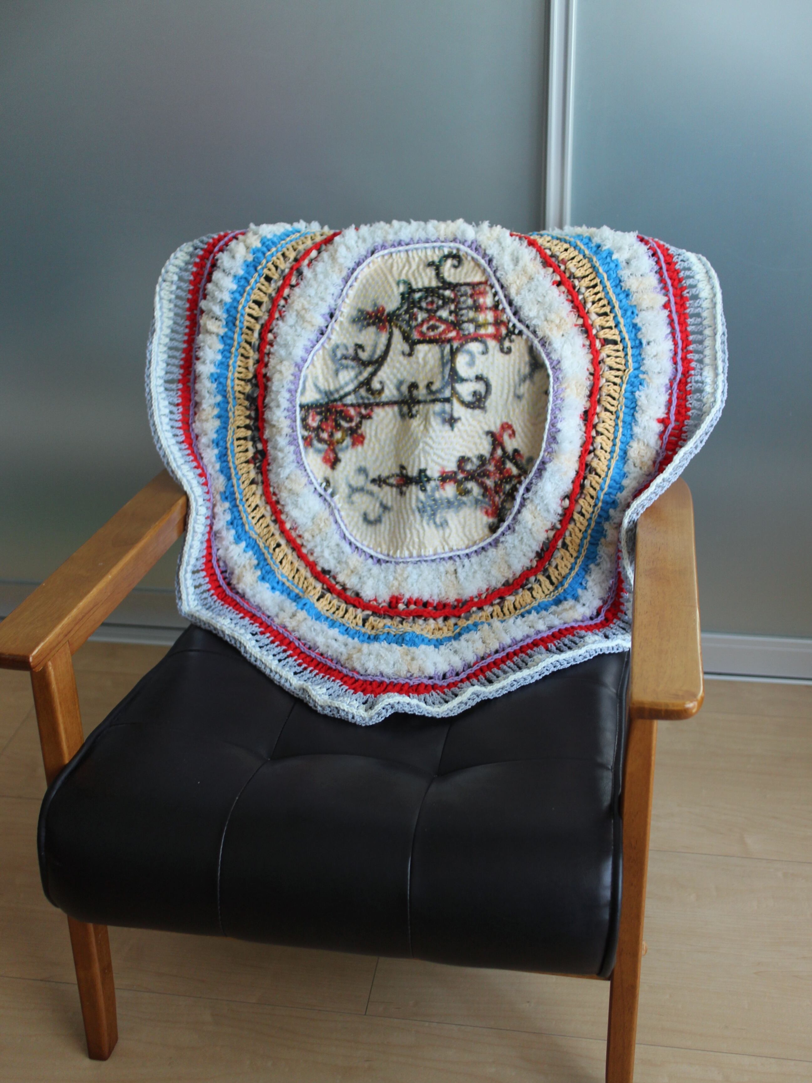 銘仙生地に刺し子をし、糸状に裂いた布と毛糸を編んで仕上げたマルチカバー